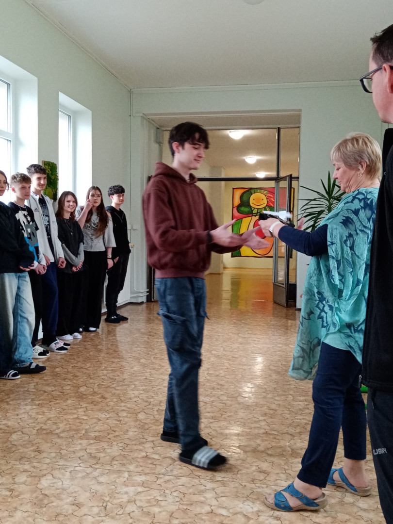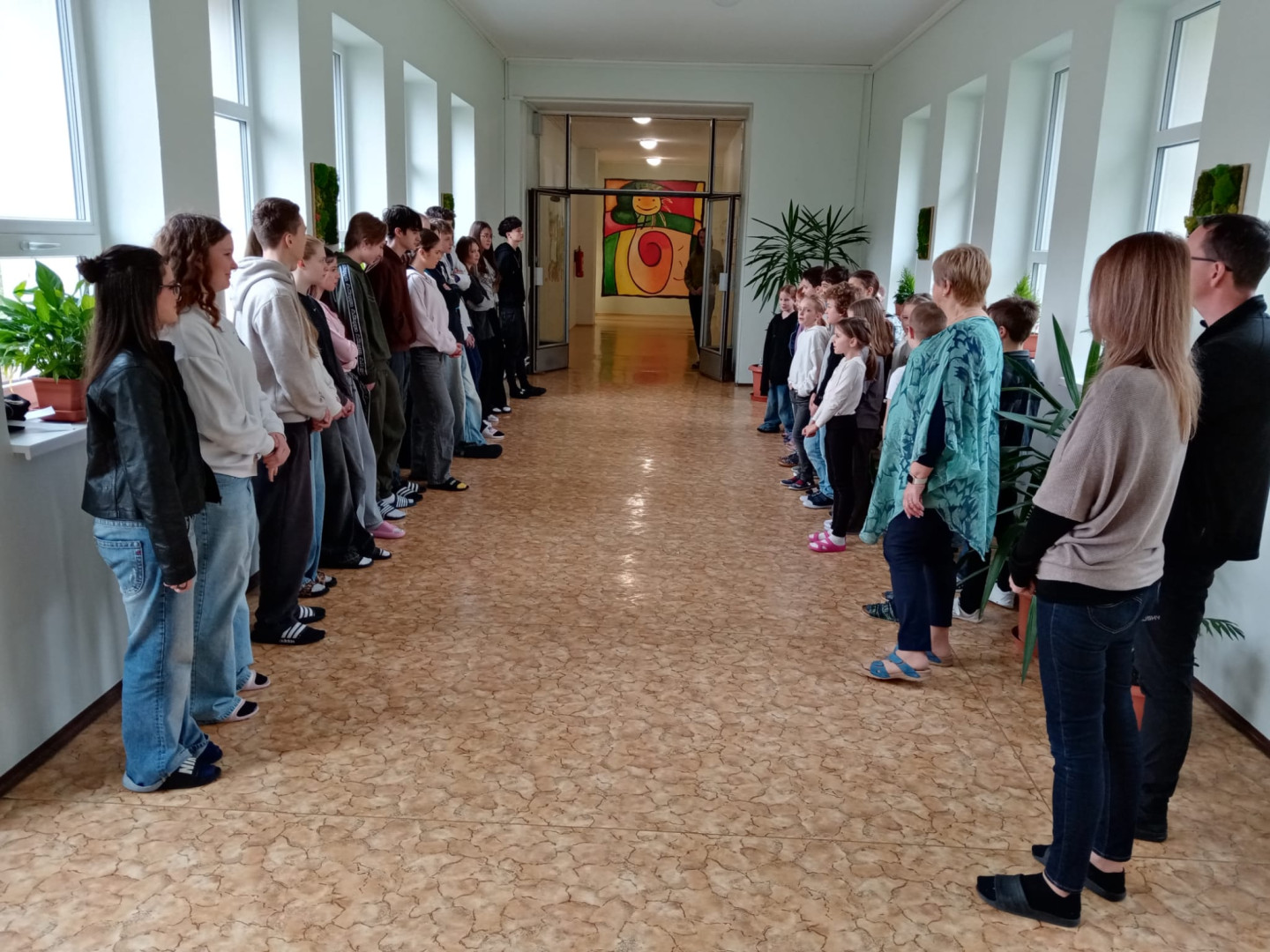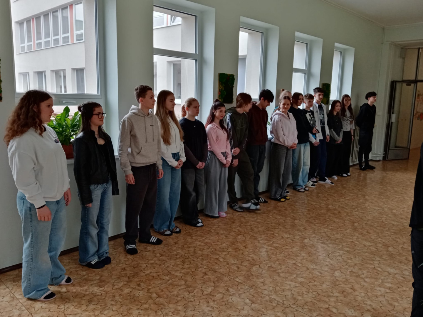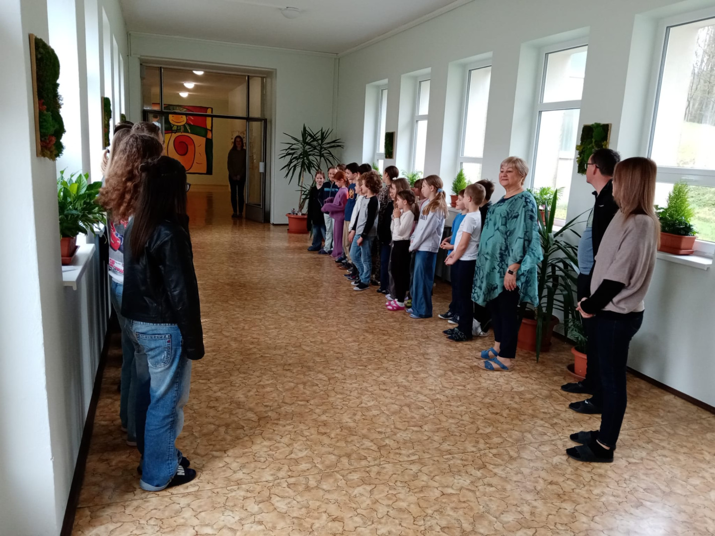 S žáky 9.B se letos přišla písničkou rozloučit třída 3.C. Paní ředitelka krátce promluvila k žákům, popřála jim hodně štěstí u přijímacích zkoušek a předala jim trička.