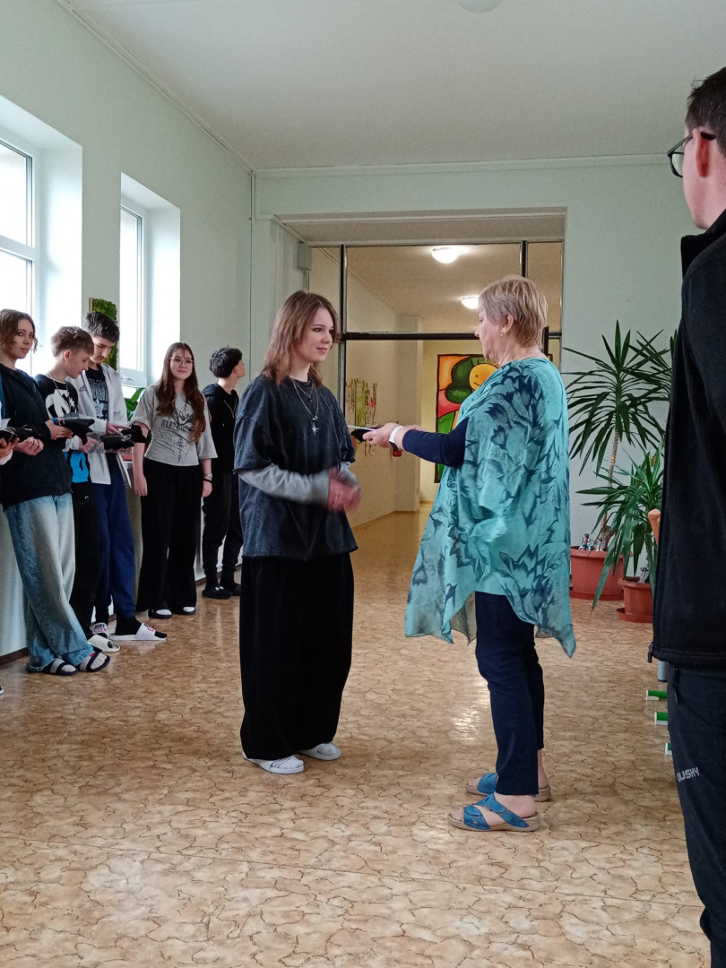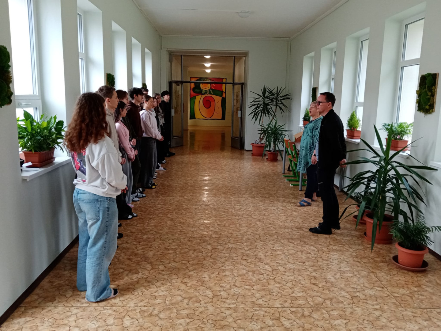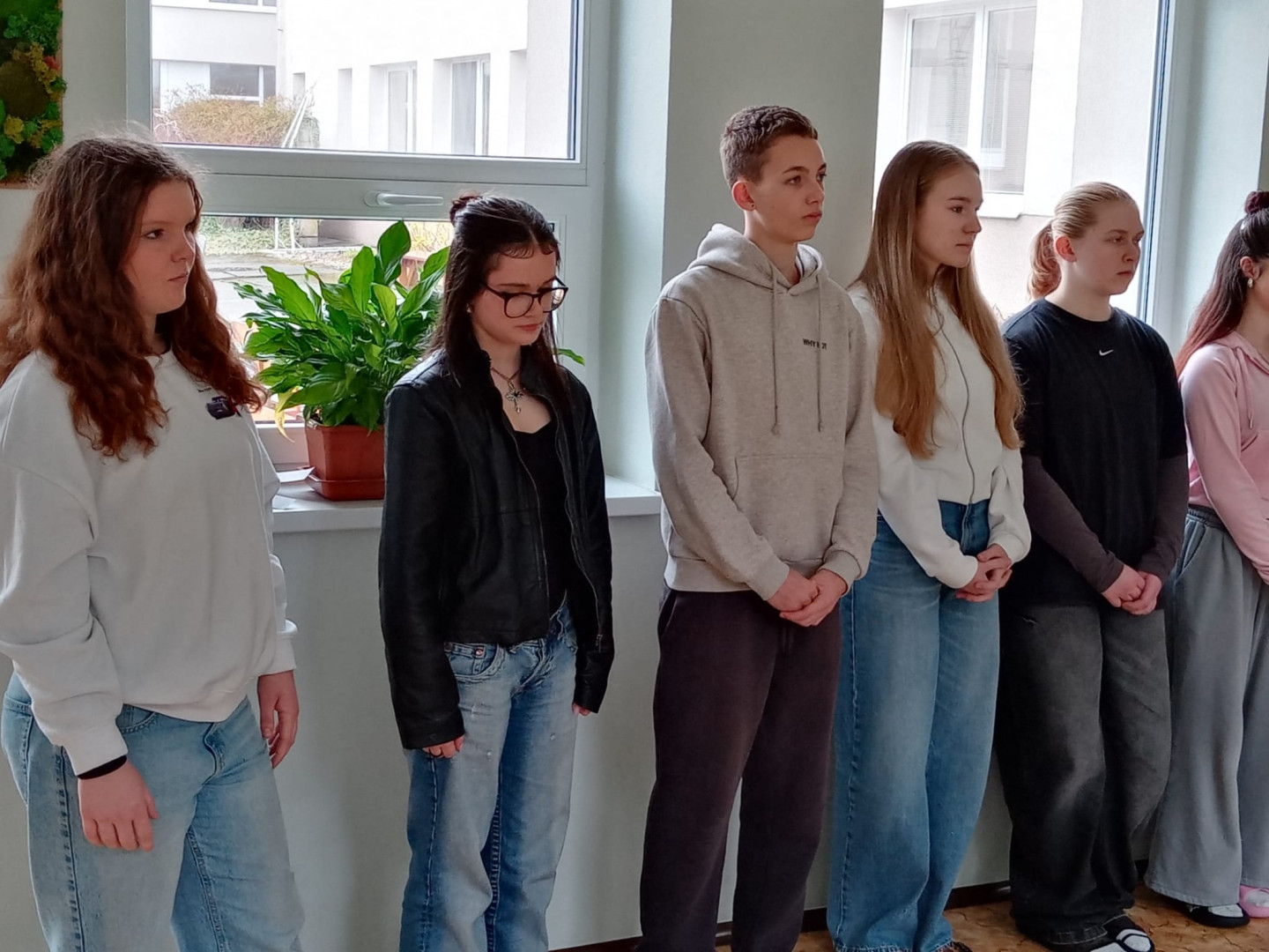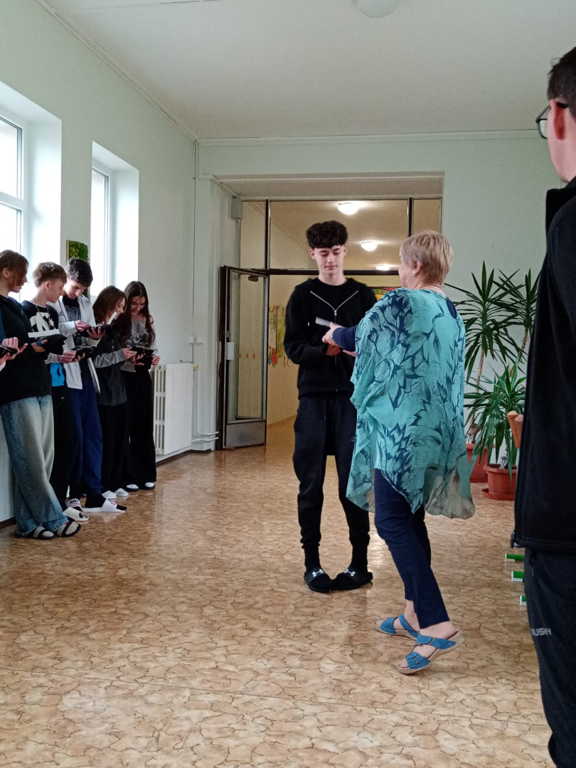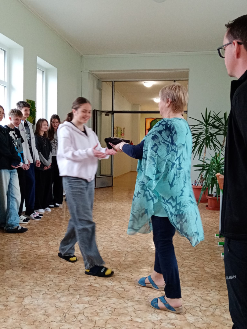 S žáky 9.B se letos přišla písničkou rozloučit třída 3.C. Paní ředitelka krátce promluvila k žákům, popřála jim hodně štěstí u přijímacích zkoušek a předala jim trička.