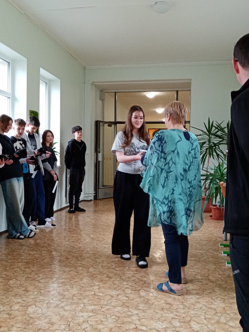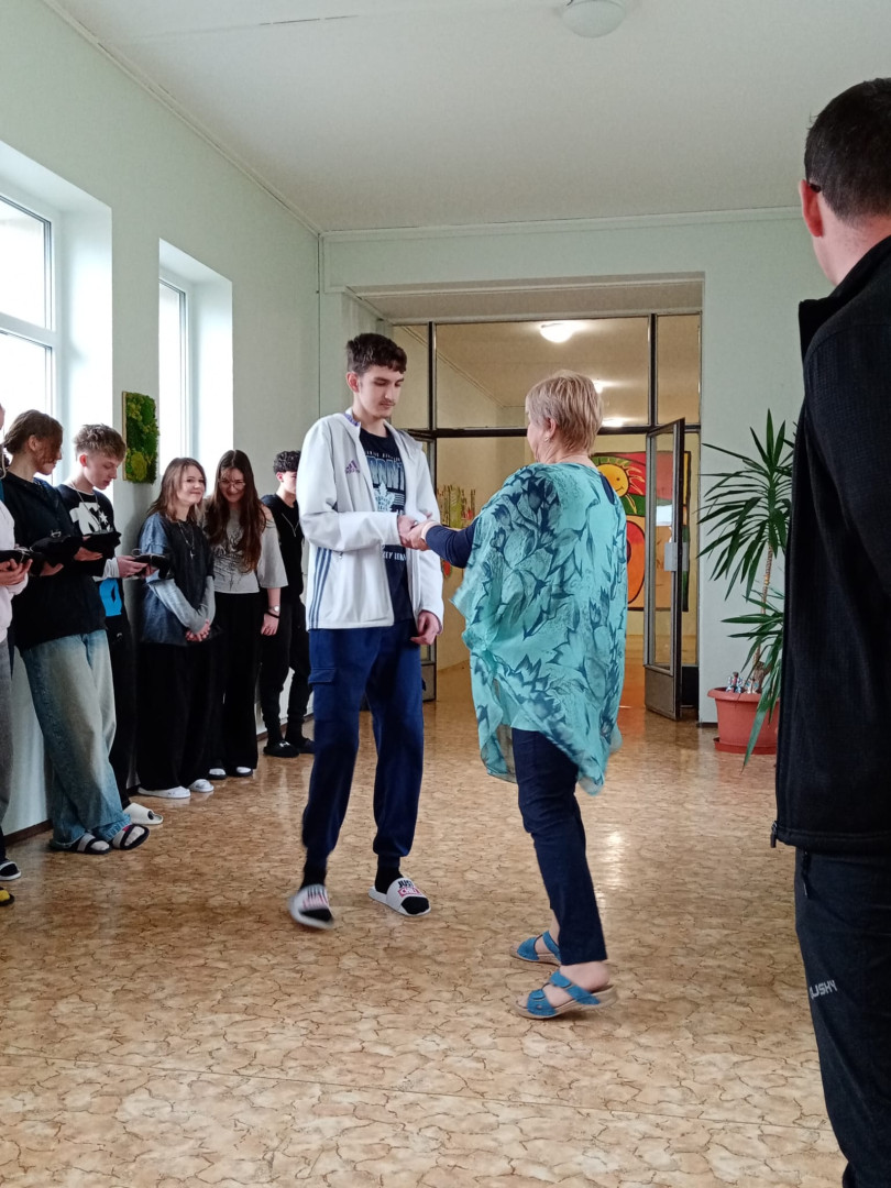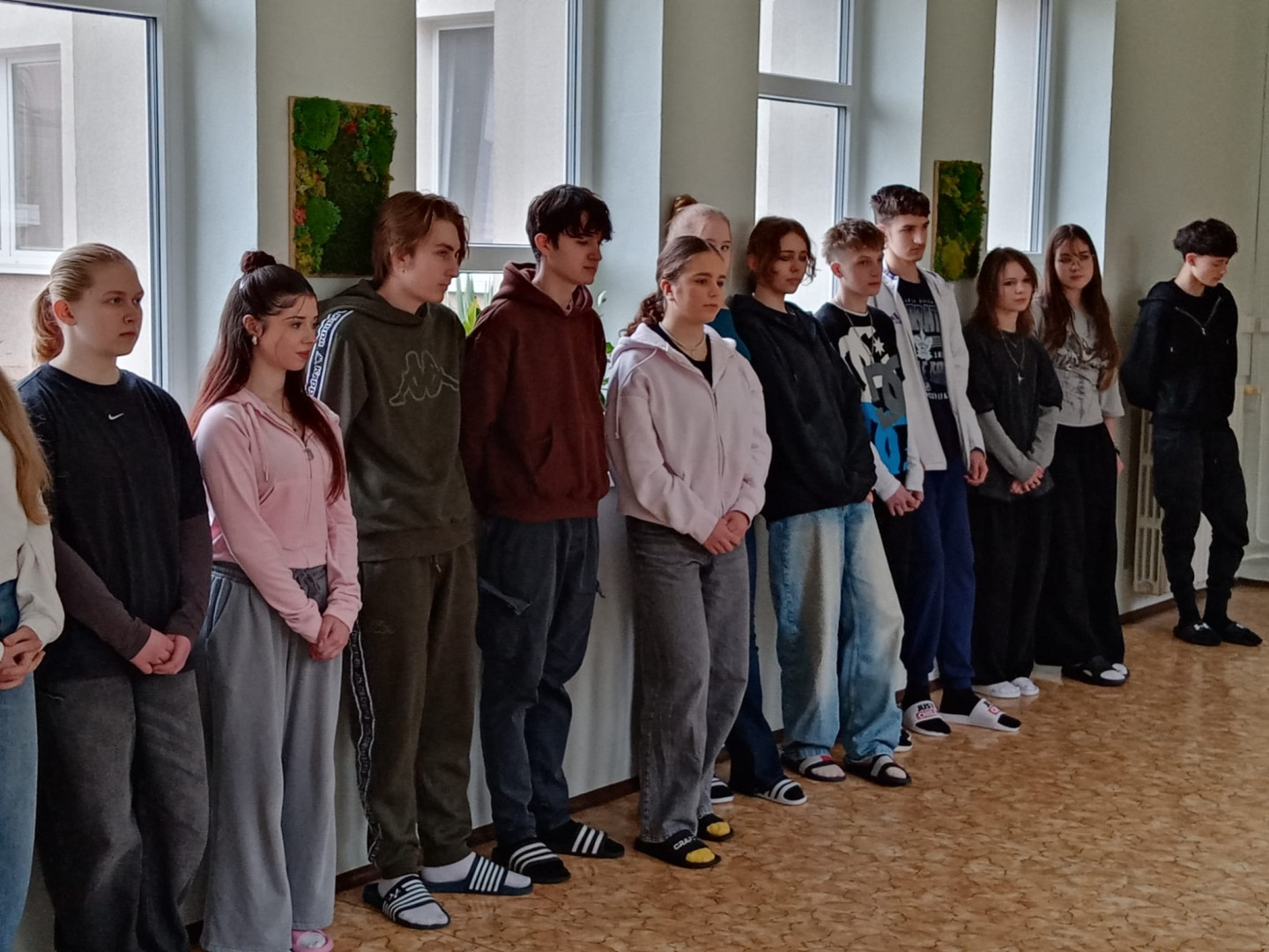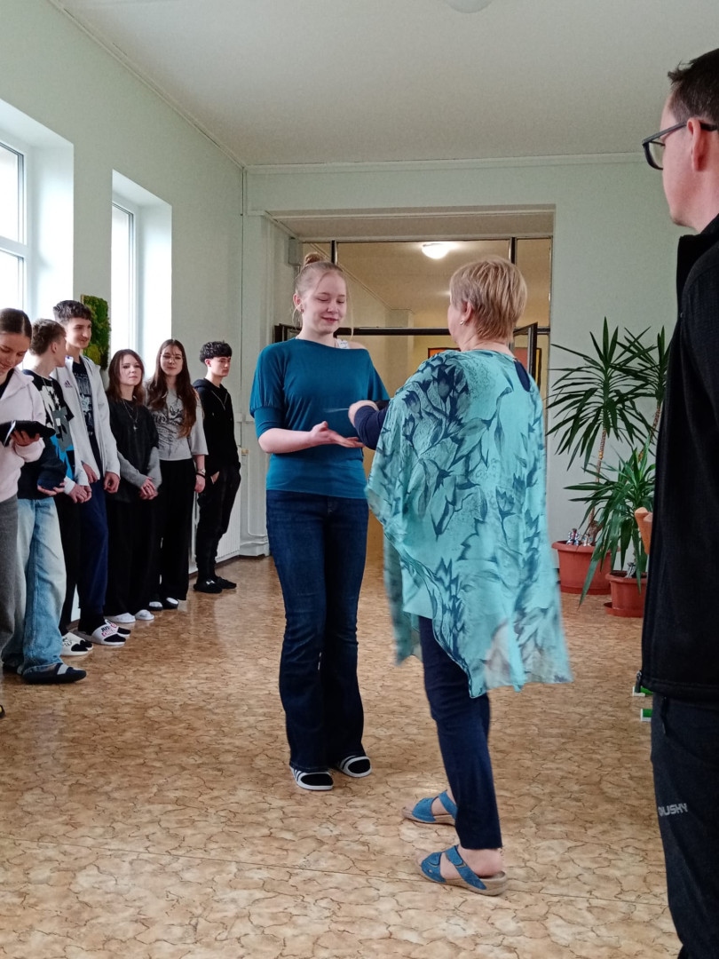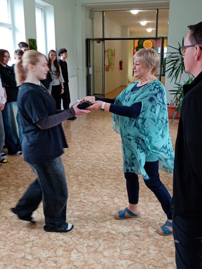 S žáky 9.B se letos přišla písničkou rozloučit třída 3.C. Paní ředitelka krátce promluvila k žákům, popřála jim hodně štěstí u přijímacích zkoušek a předala jim trička.