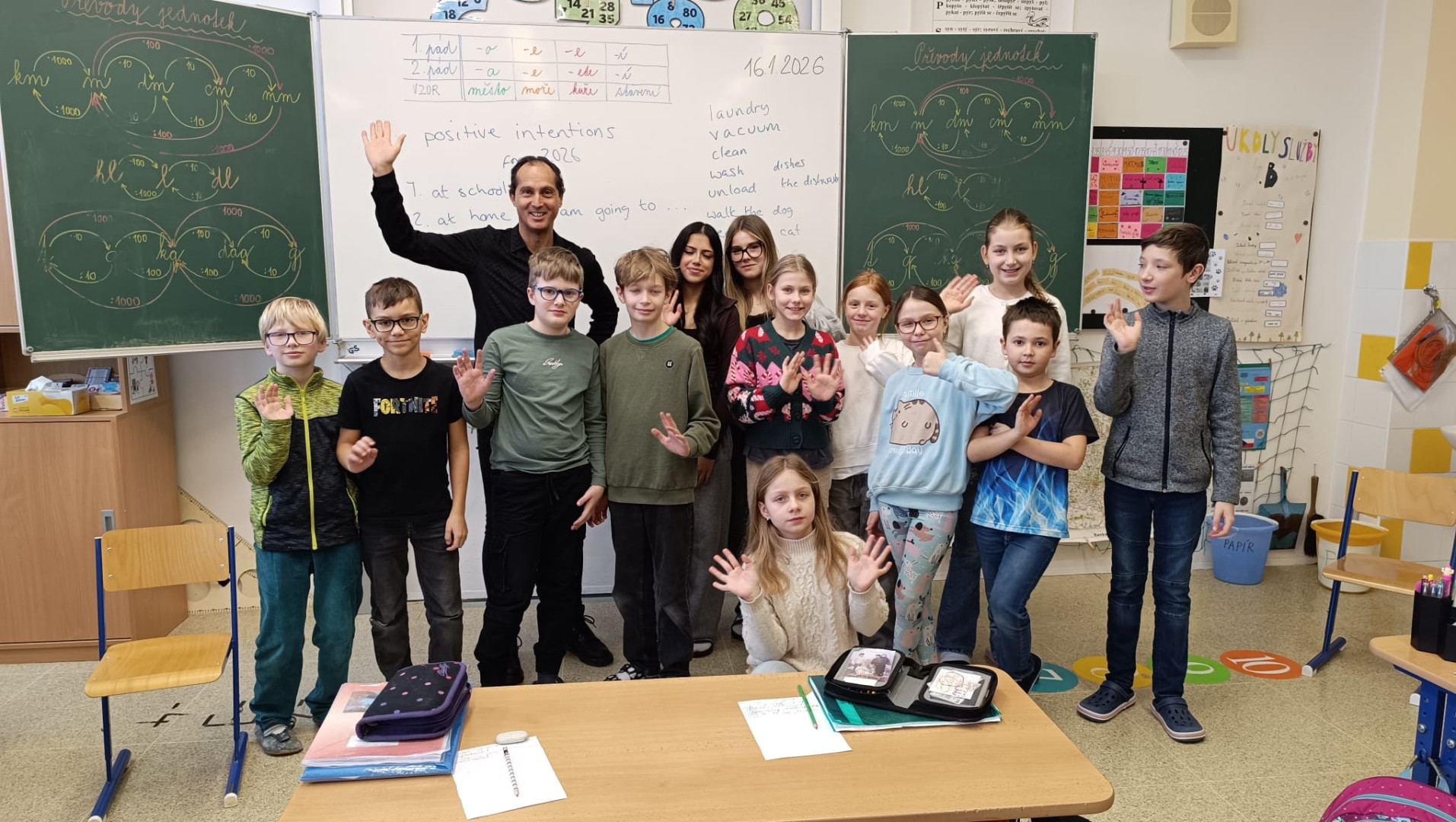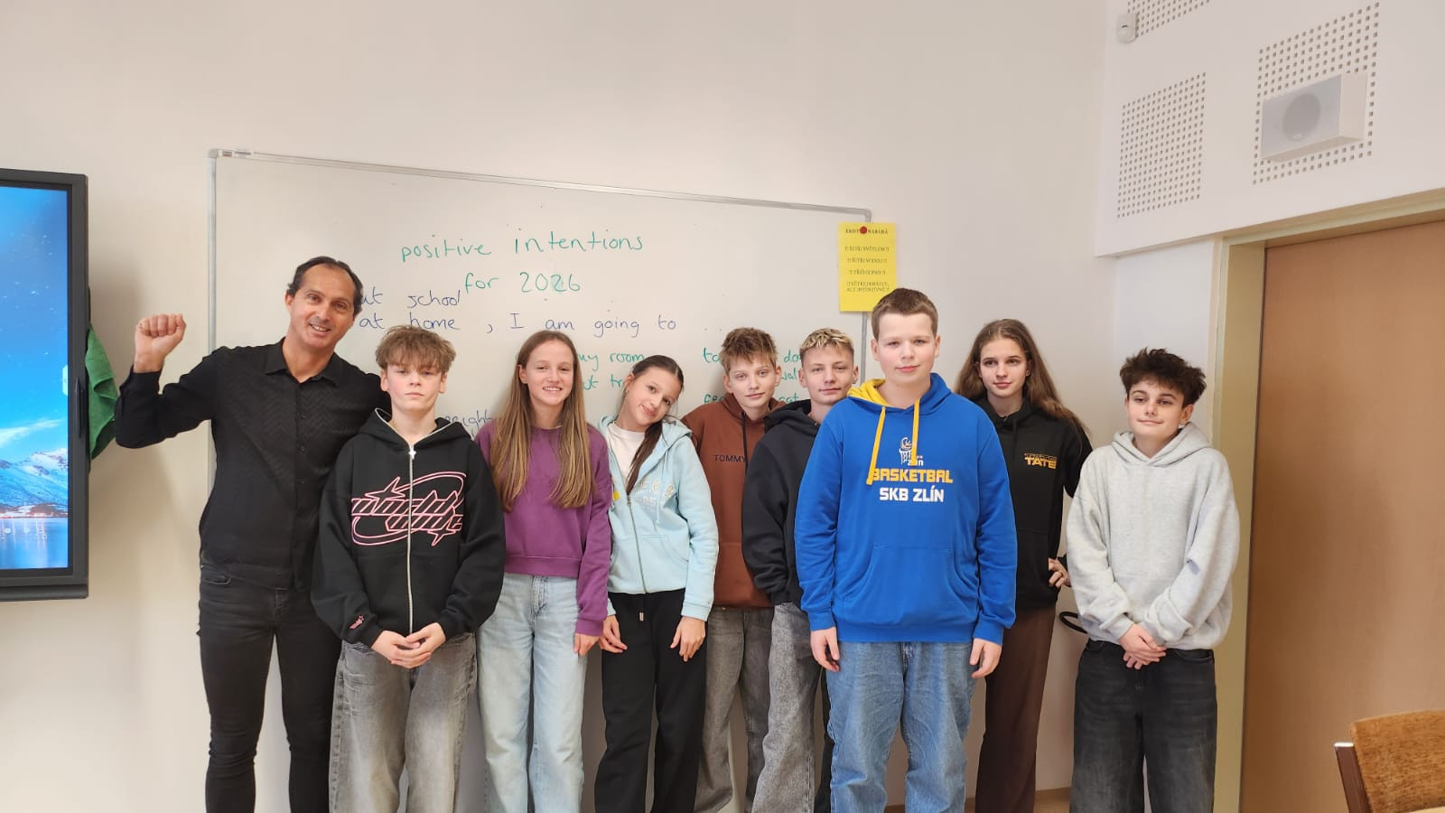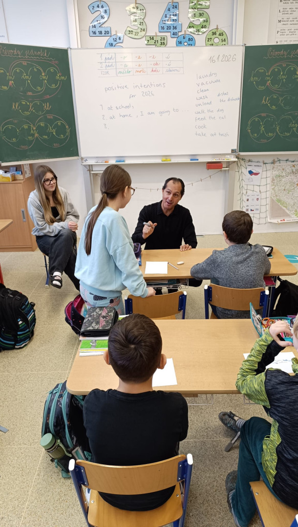 „Positive intentions for 2026“ (Pozitivní předsevzetí pro rok 2026) – to bylo tématem lednových hodin angličtiny s naším oblíbeným lektorem Karlem Martinem. O svých plánech doma, ve škole a v místě bydliště mluvili žáci z 4.B, 5.B, 7.A, 7.B, 9.A a 9.C. Mladším žákům pomáhali žáci z 9.C.