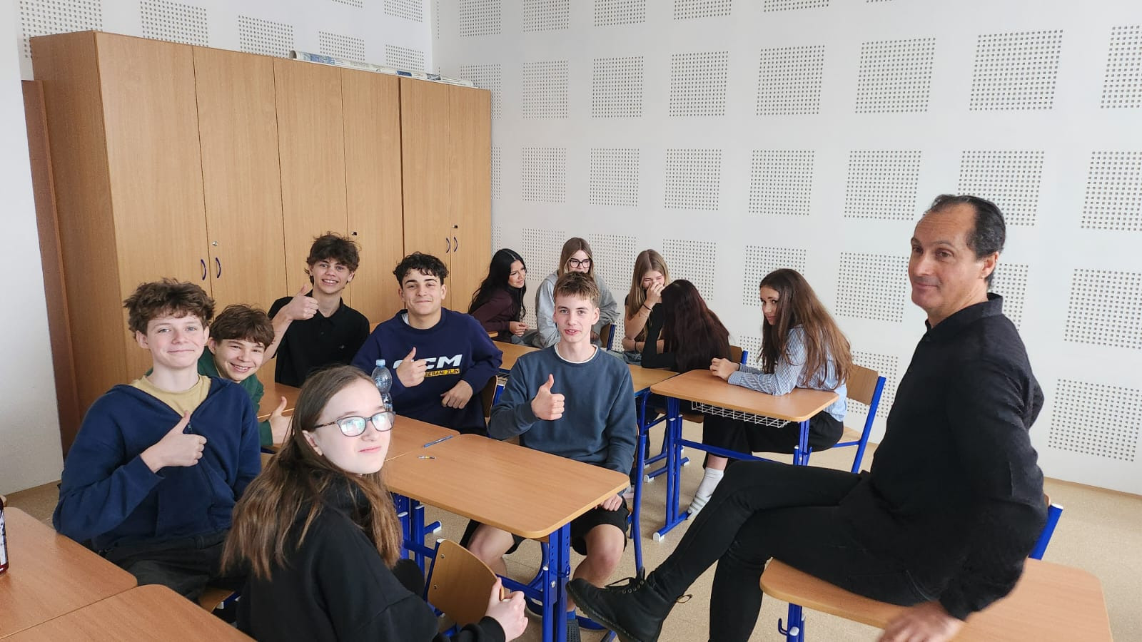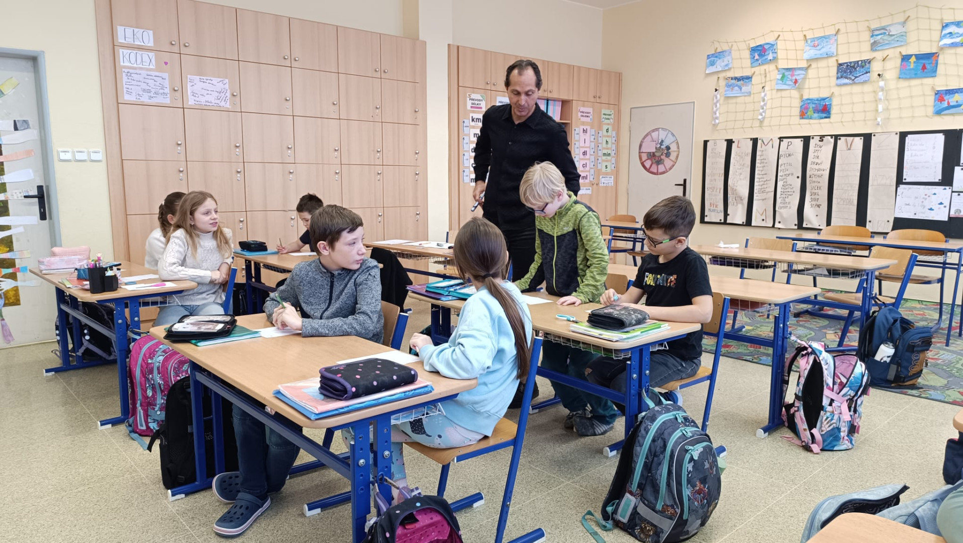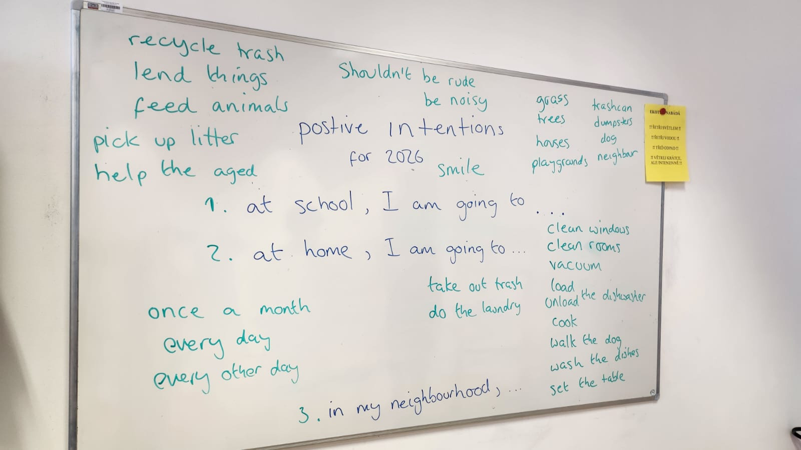 „Positive intentions for 2026“ (Pozitivní předsevzetí pro rok 2026) – to bylo tématem lednových hodin angličtiny s naším oblíbeným lektorem Karlem Martinem. O svých plánech doma, ve škole a v místě bydliště mluvili žáci z 4.B, 5.B, 7.A, 7.B, 9.A a 9.C. Mladším žákům pomáhali žáci z 9.C.