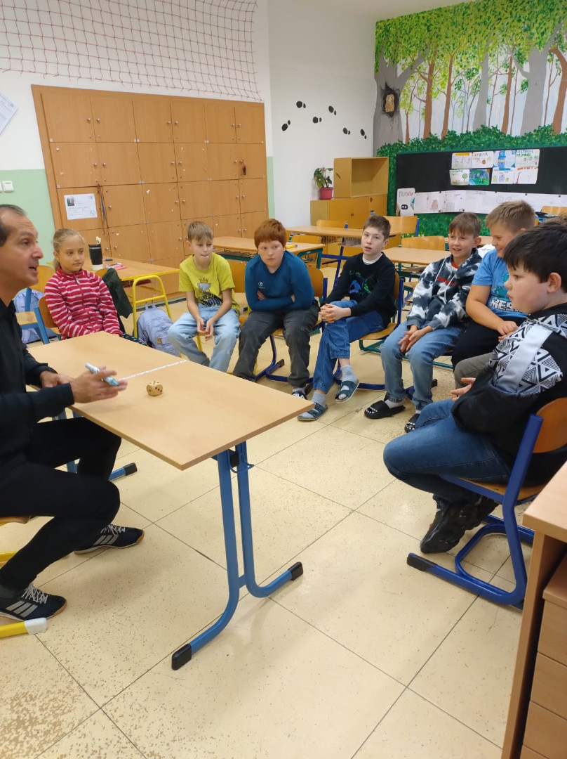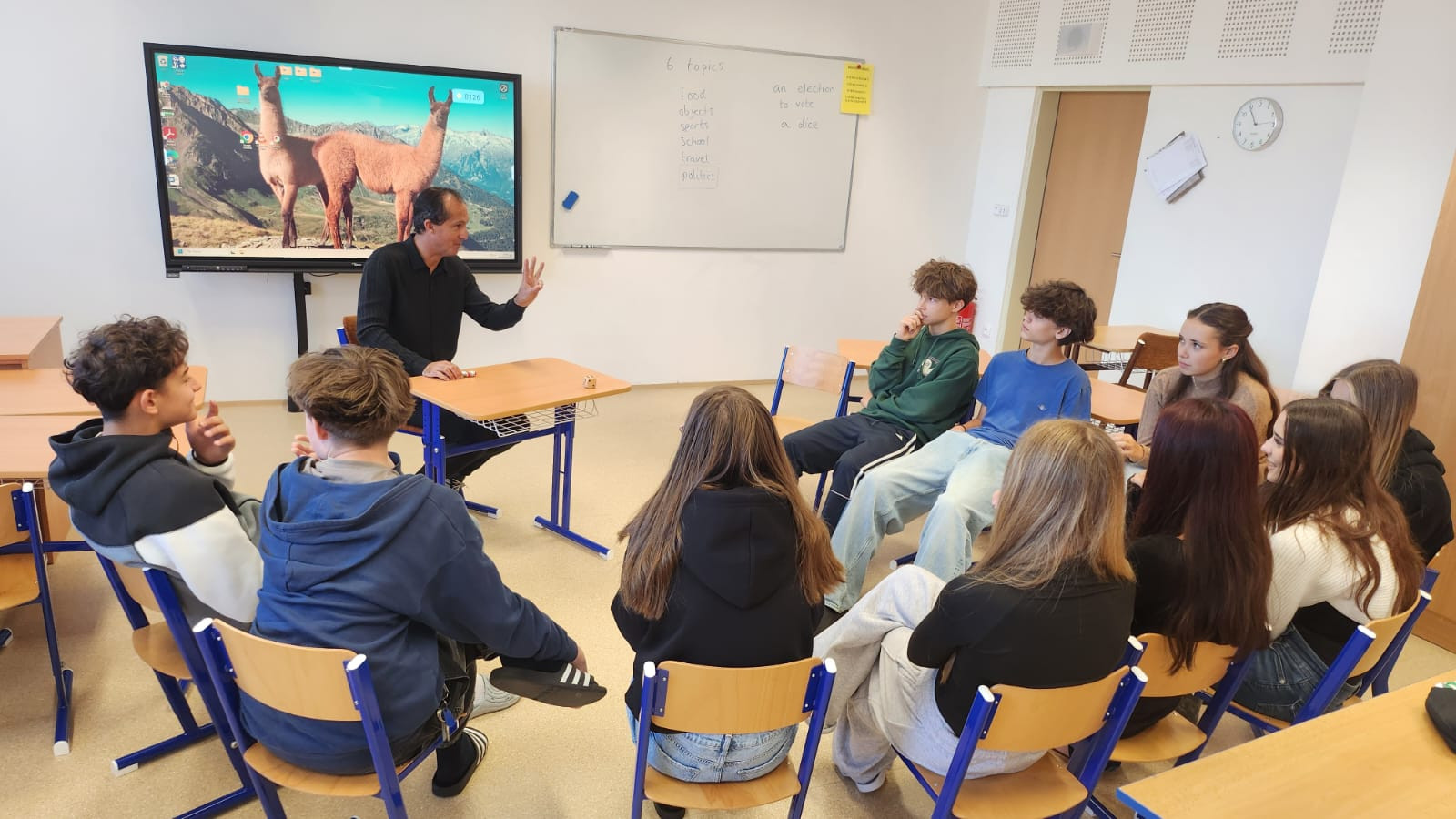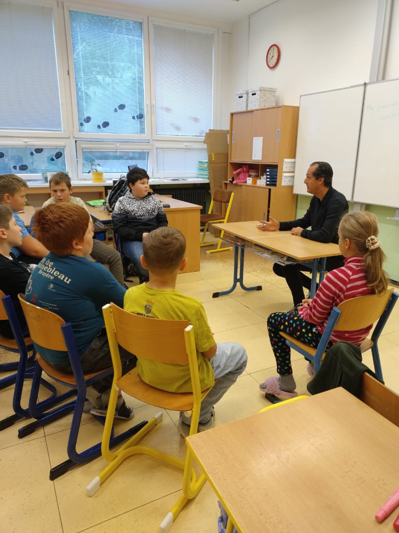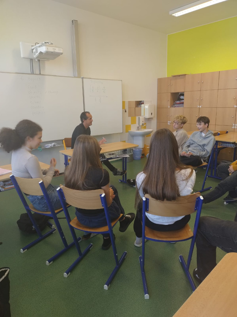Již pátým rokem nám budou hodiny angličtiny zpestřovat rodilí mluvčí. V pátek 3. 9. 2025 k nám zavítal náš oblíbený lektor Karl Martin. Do konverzace v angličtině zapojil vždy všechny žáky ve skupině. Hod kostkou rozhodl o tématu, v některých třídách se řešila oblíbená jídla a sportovní aktivity, starší žáci si měli například představit, že mají moc změnit cokoliv na světě a mohli popustit uzdu své fantazii a vymyslet, co vše by mohlo fungovat jinak.
