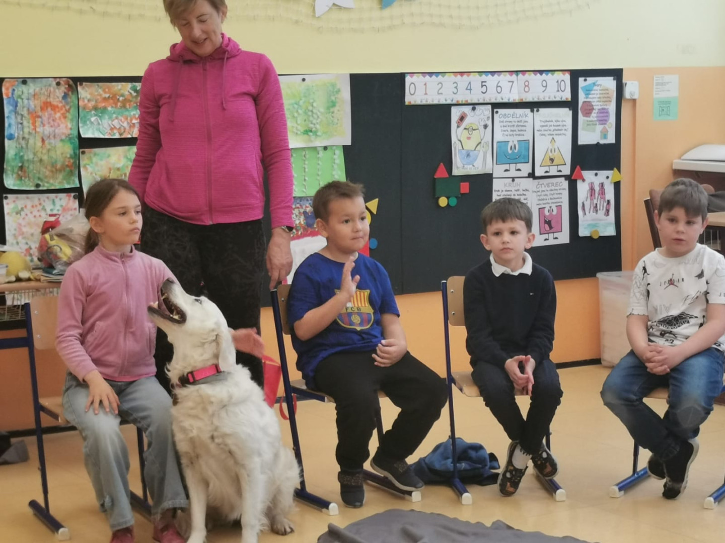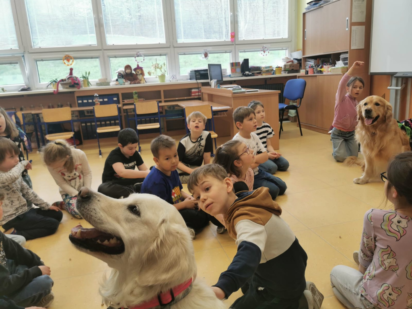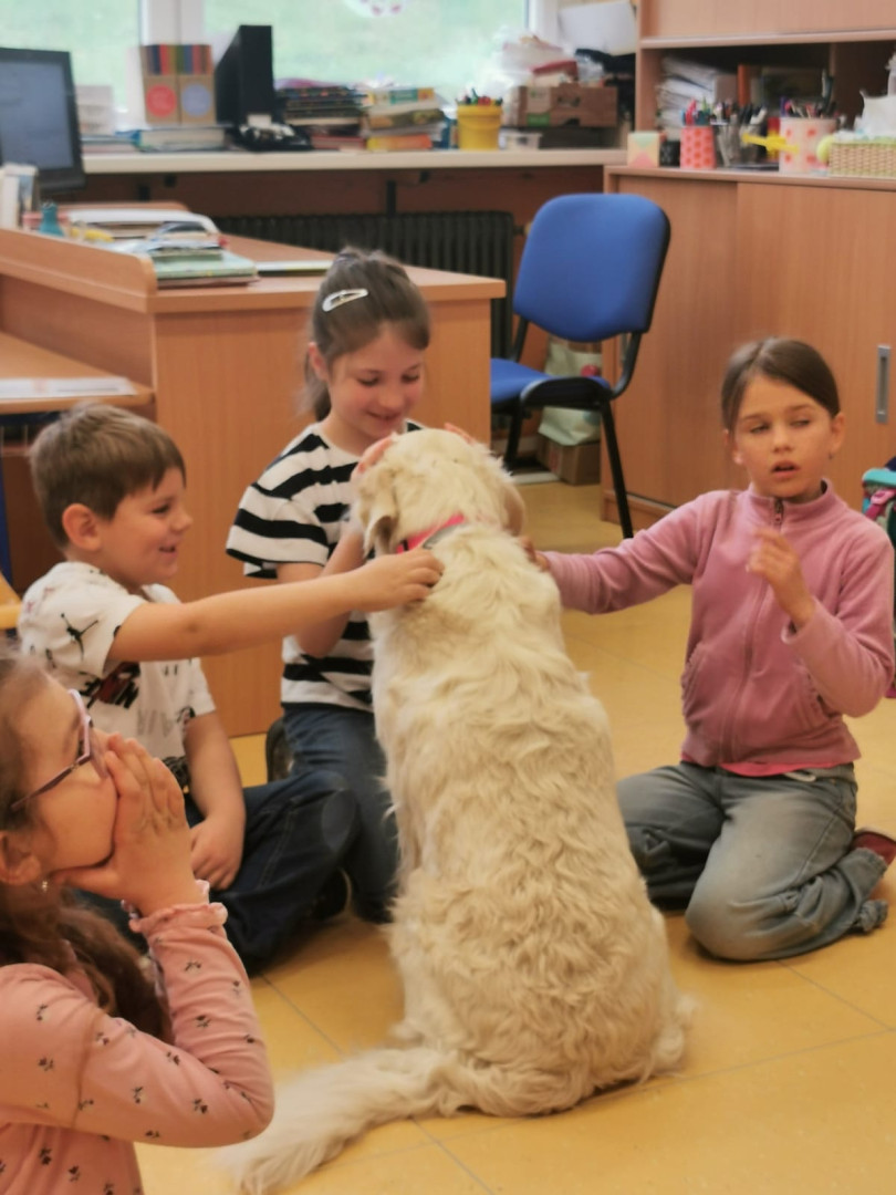 Naše prvňáčky navštívili vzácní hosté – pejsci z organizace Bratrstvo psích tlapek. Děti se dozvěděly mnoho zajímavého o tom, jak správně pečovat o psy a jak porozumět jejich chování.