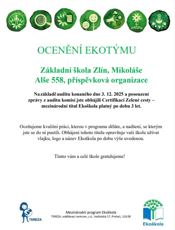 Na základě auditu konaného 3.12.2025 a posouzení zprávy z auditu komisí jsme obhájili Certifikaci Zelené cesty - mezinárodní titul Ekoškola platný po dobu 3 let.