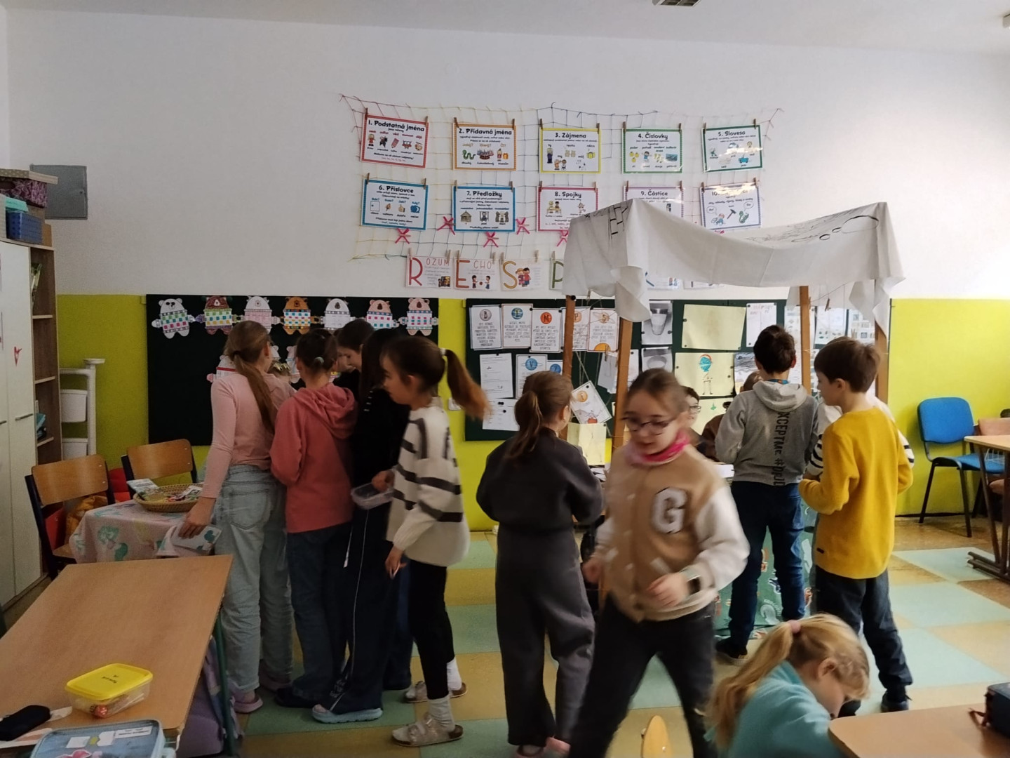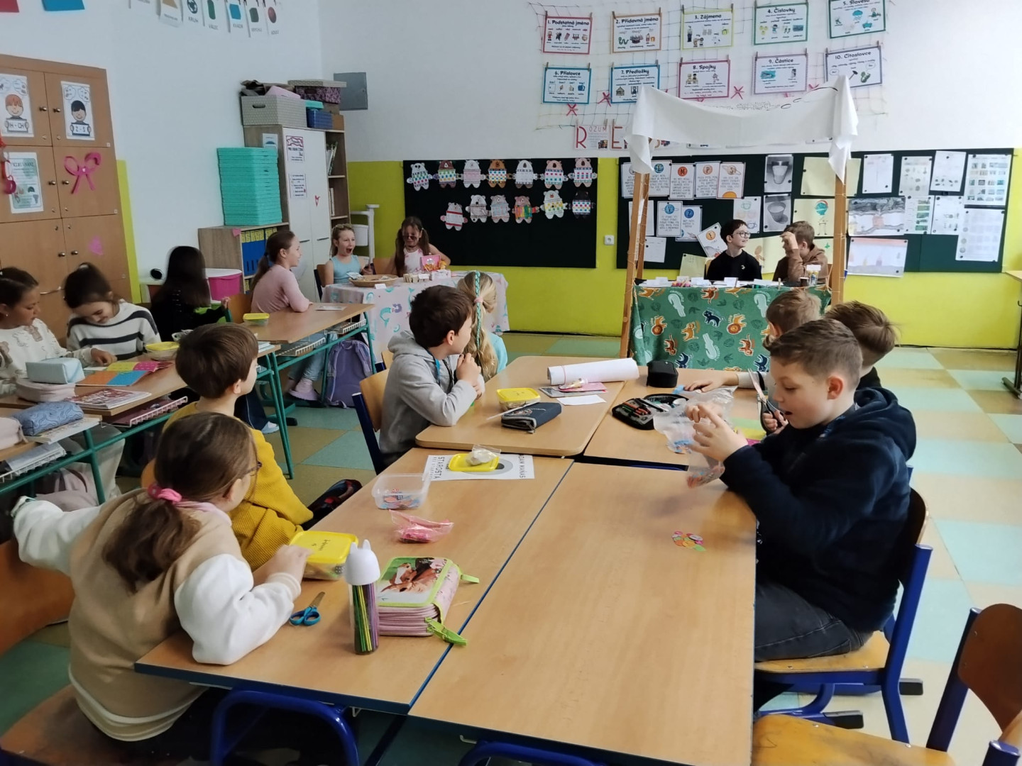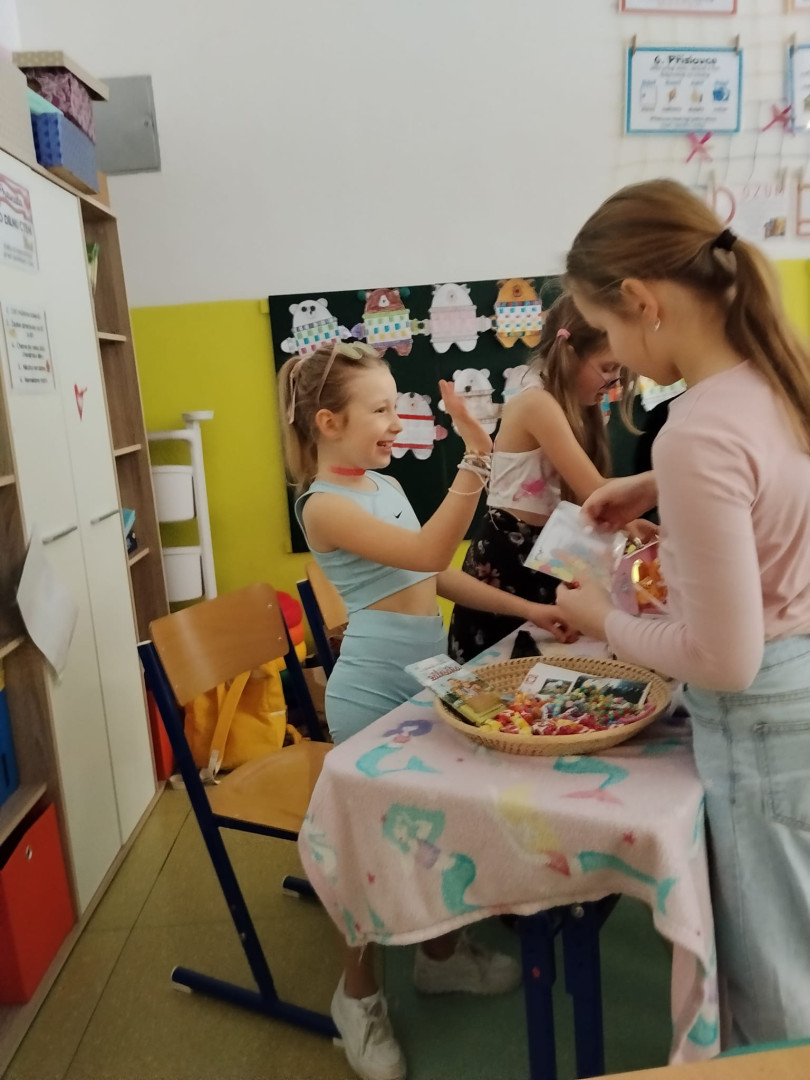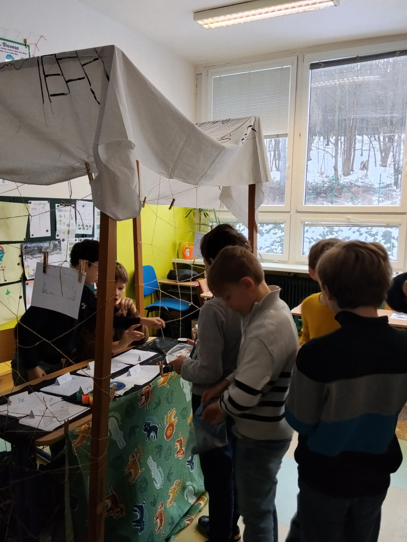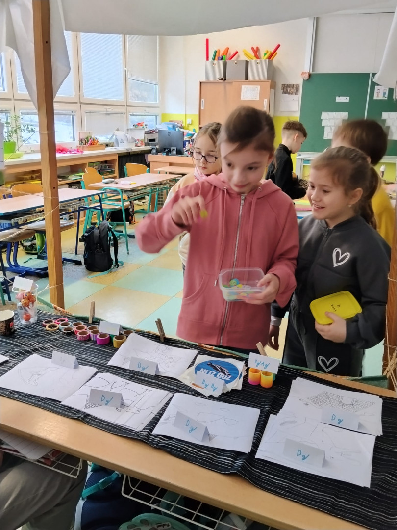 Dnešní dopoledne se naše třída proměnila v exotické tržiště. Třídu 3.B totiž navštívili obchodníci z daleké a tajuplné země Biland. Žáci se na chvíli stali trhovci a museli se popasovat s výzvami, které by zamotaly hlavu i zkušeným ekonomům. Prvním oříškem byla komunikace. Bilandští obchodníci jsou sice velmi přátelští, ale jejich jazyk je pro nás nezvyklý – používají totiž pouze dvě hlásky. Celá domluva tak připomínala rytmické bubnování nebo tajný kód. Ještě překvapivější bylo zjištění, že v Bilandu neznají naše číslice. Počítají pouze s 0 a 1, což v praxi znamenalo, že se žáci museli rychle naučit základy dvojkové soustavy, aby vůbec pochopili cenu zboží. Obchodovalo se s místní měnou – bilandskými groši. Systém mincí byl sice omezený, ale o to zajímavější.