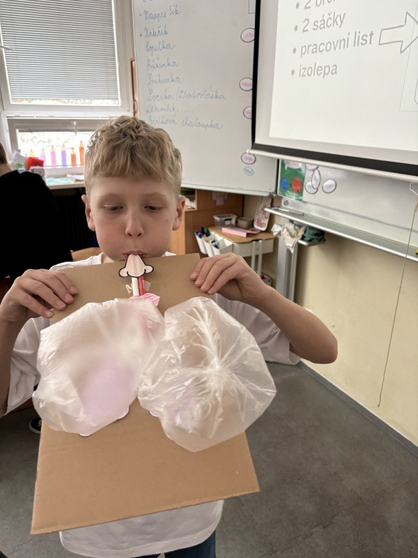 Po sestavení celého modelu zbývalo jediné. Vyzkoušet, jak plíce skutečně fungují. Při fouknutí do brček se sáčky okamžitě začaly nafukovat a následně opět vyfukovat. Žáci tak mohli názorně pozorovat, jak proudění vzduchu ovlivňuje „plíce“ v jejich modelu.