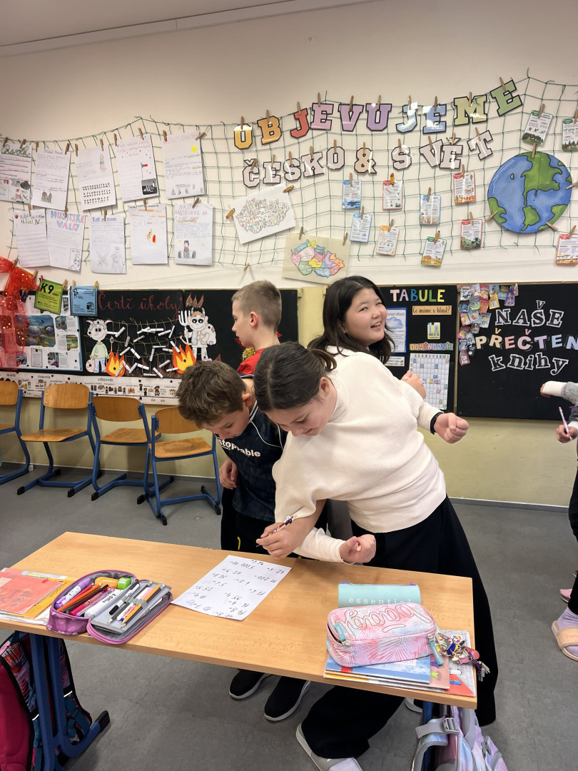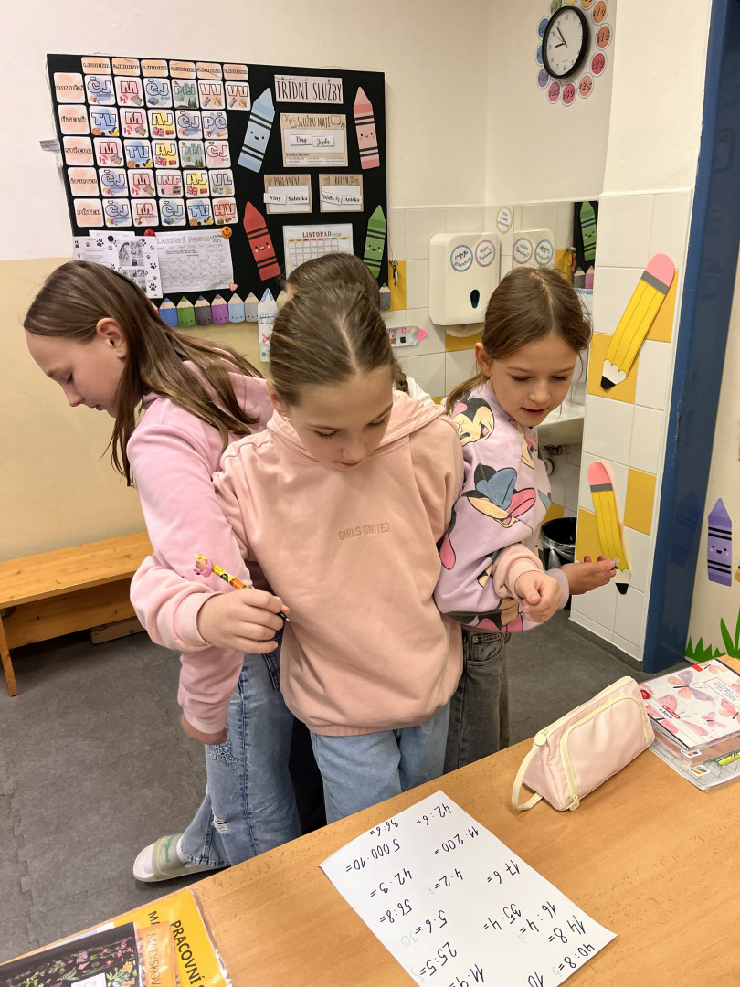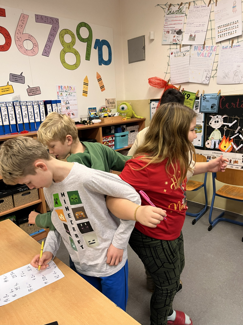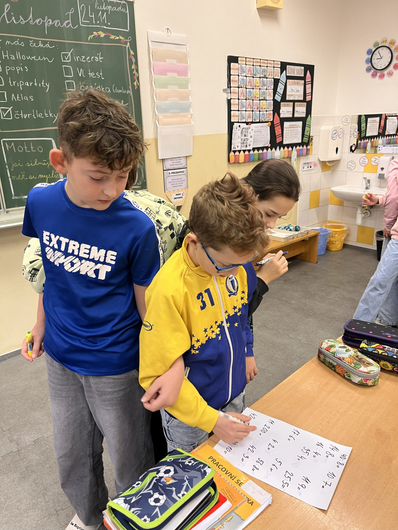 Žáci 5. A ví, že matematika je všechno, jen ne nuda. V hodinách matematiky hrají různé hry, při kterých počítají a procvičují učivo.