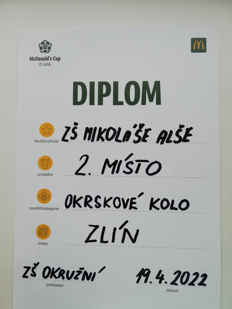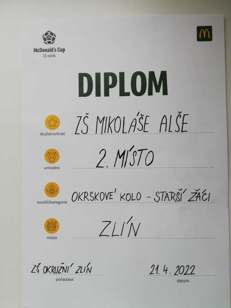 Dne 19. a 21. 4. 2022 se vybraní žáci z I. stupně zúčastnili tradičního fotbalového turnaje s názvem McDonald´s Cup, který se konal po oba dva dny na ZŠ Okružní. V okrskovém kole jsme podali výborné výkony, které stačily na krásné 2. místo, a to jak u mladší, tak i u starší kategorie. Zvláště u starší kategorie chybělo k postupu jen malinko, protože naši žáci ani v jednom utkání neprohráli, inkasovali pouze 1 branku a pouze vinou horšího skóre skončili druzí.
