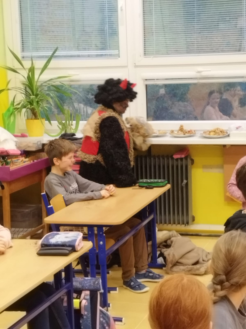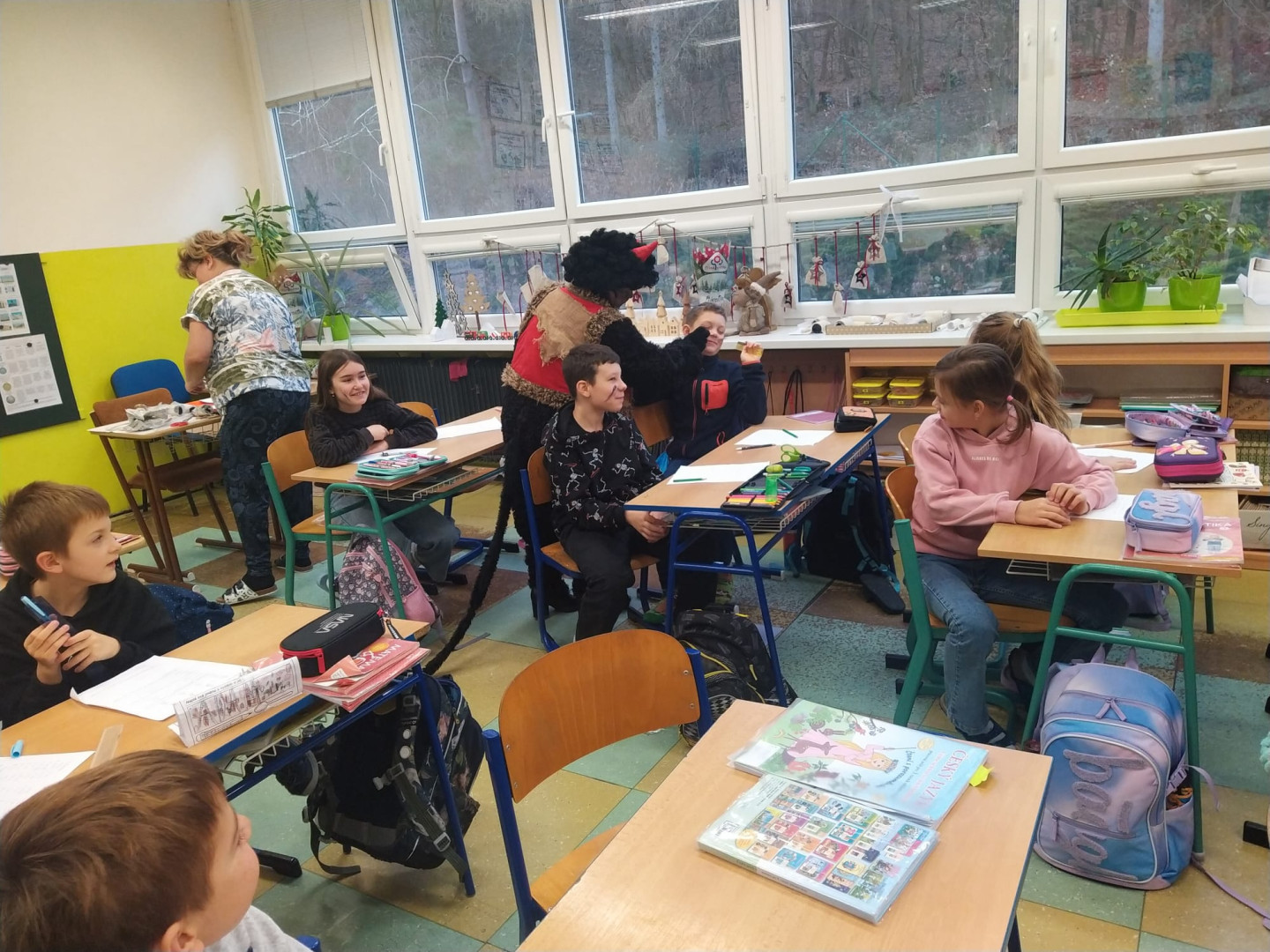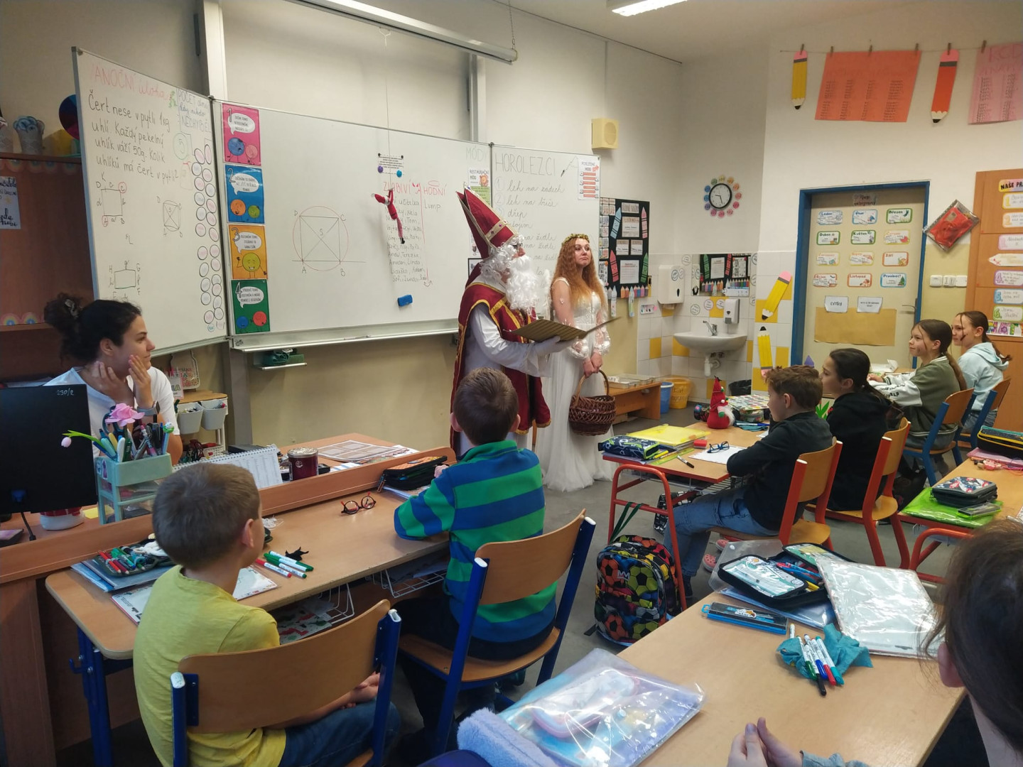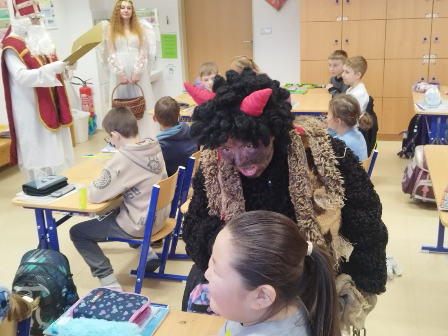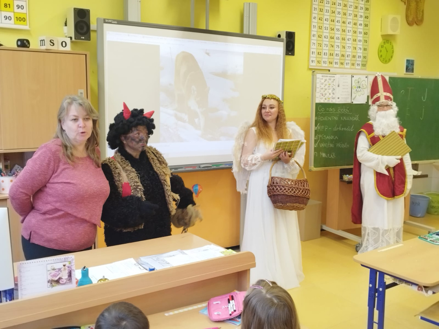 Tak jako každý rok i letos zavítal do naší školy Mikuláš se svými věrnými pomocníky – andělem a čertem. Jejich kroky je zavedly hlavně k žákům prvního stupně, kteří se na jejich příchod těšili už od rána a nemohli se dočkat.