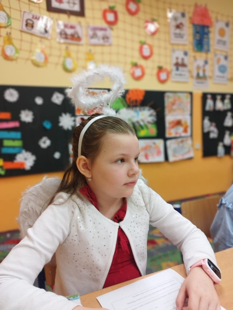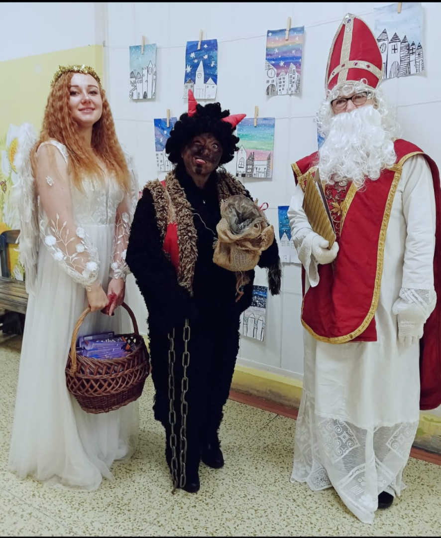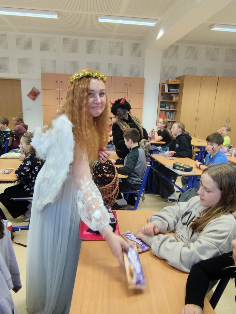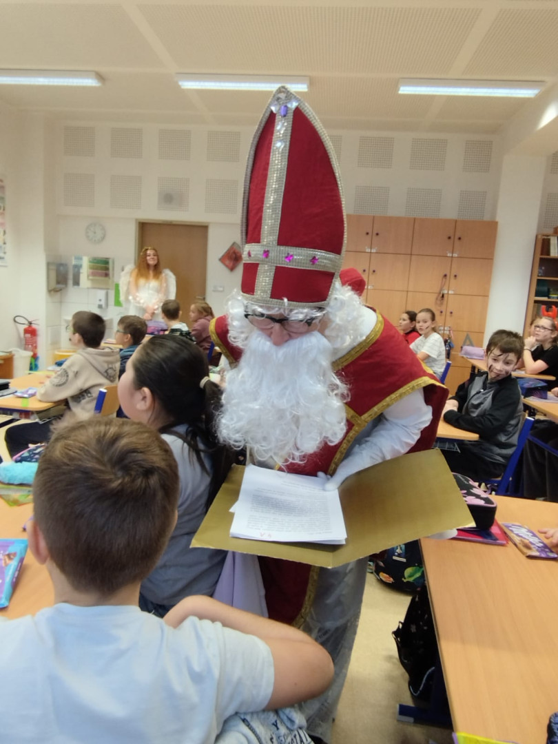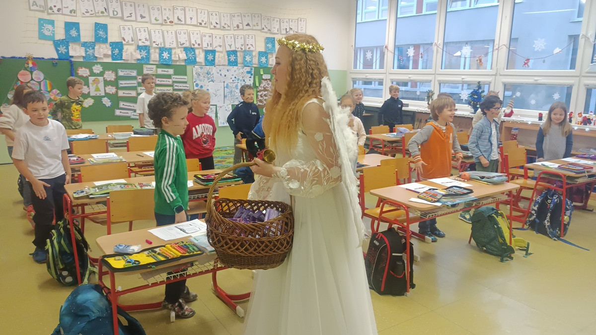 Naštěstí jeho dovádění vyvážil anděl, který všem žákům rozdával sladkou odměnu nejen za program, který si pro Mikuláše připravili, a také za slib, že budou hodní a vzorní nejen ve škole a doma, ale také, že budou na cestě do školy i ze školy velmi opatrní. Nemůže být přeci všude! A protože nemůže být opravdu vždy všudypřítomný, na druhém stupni rozdávali čokoládu jeho pomocníci – třídní učitelé.