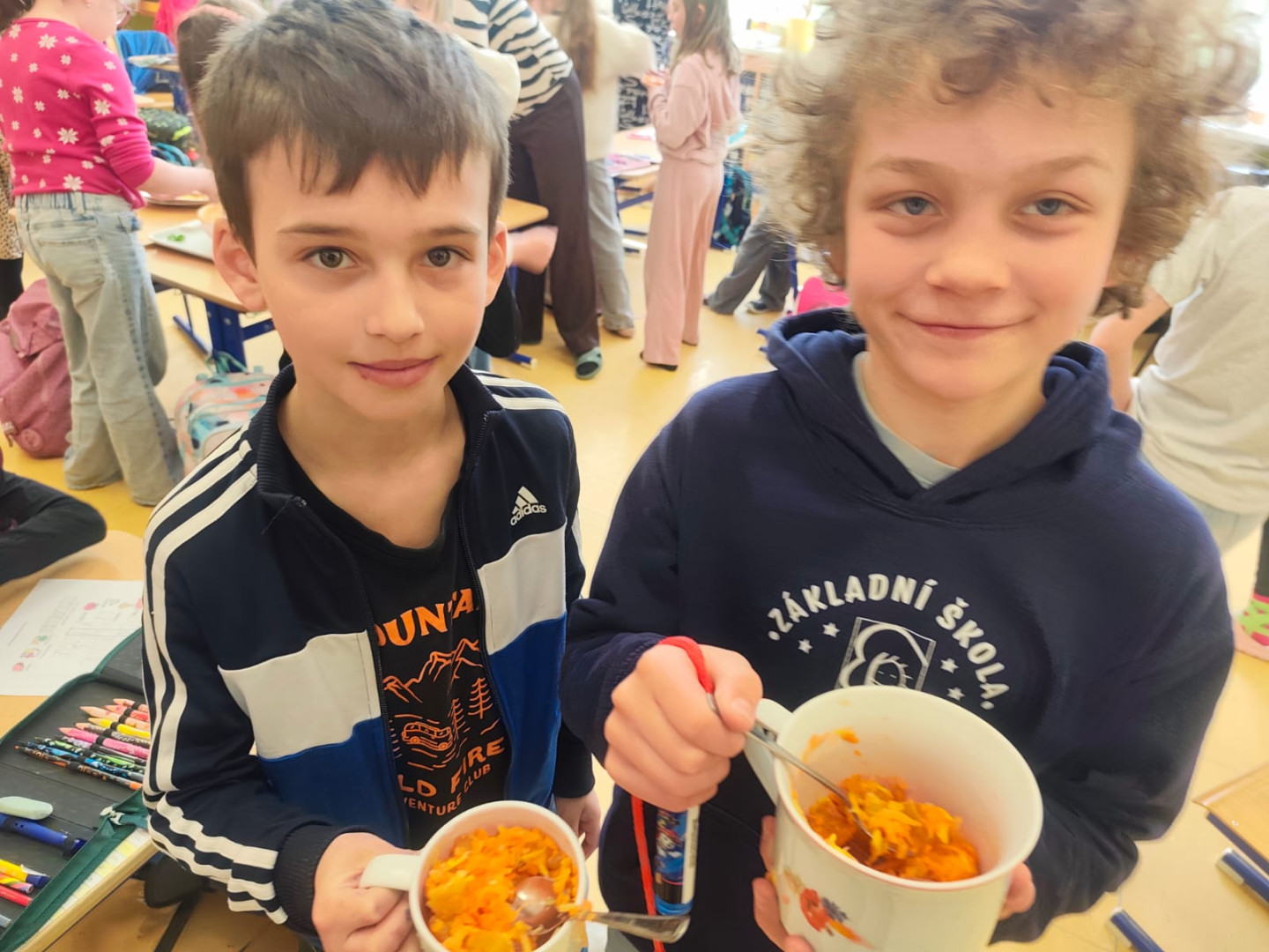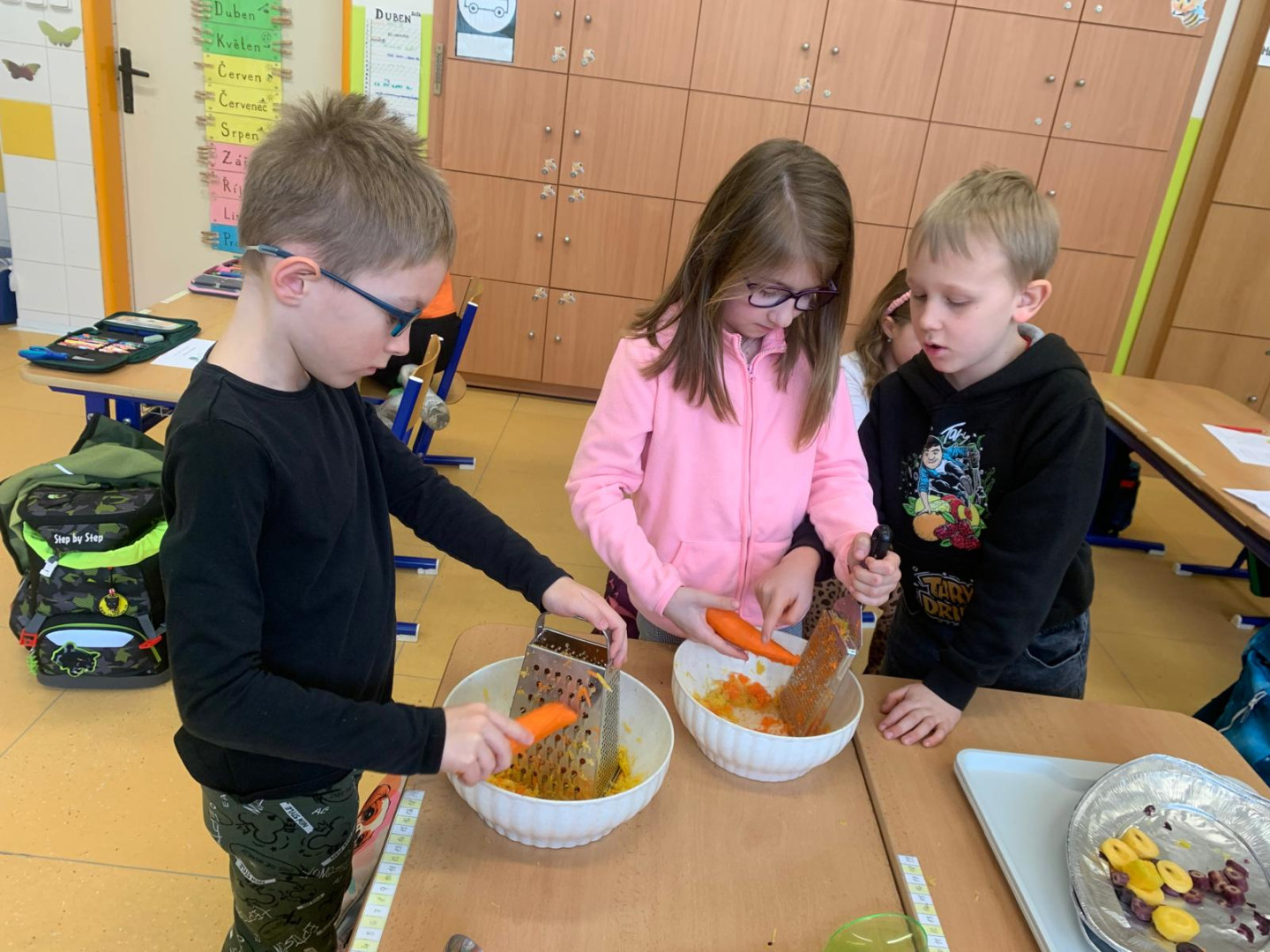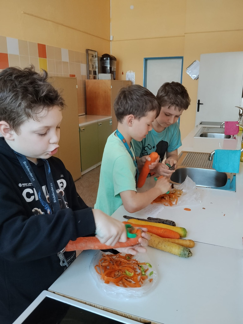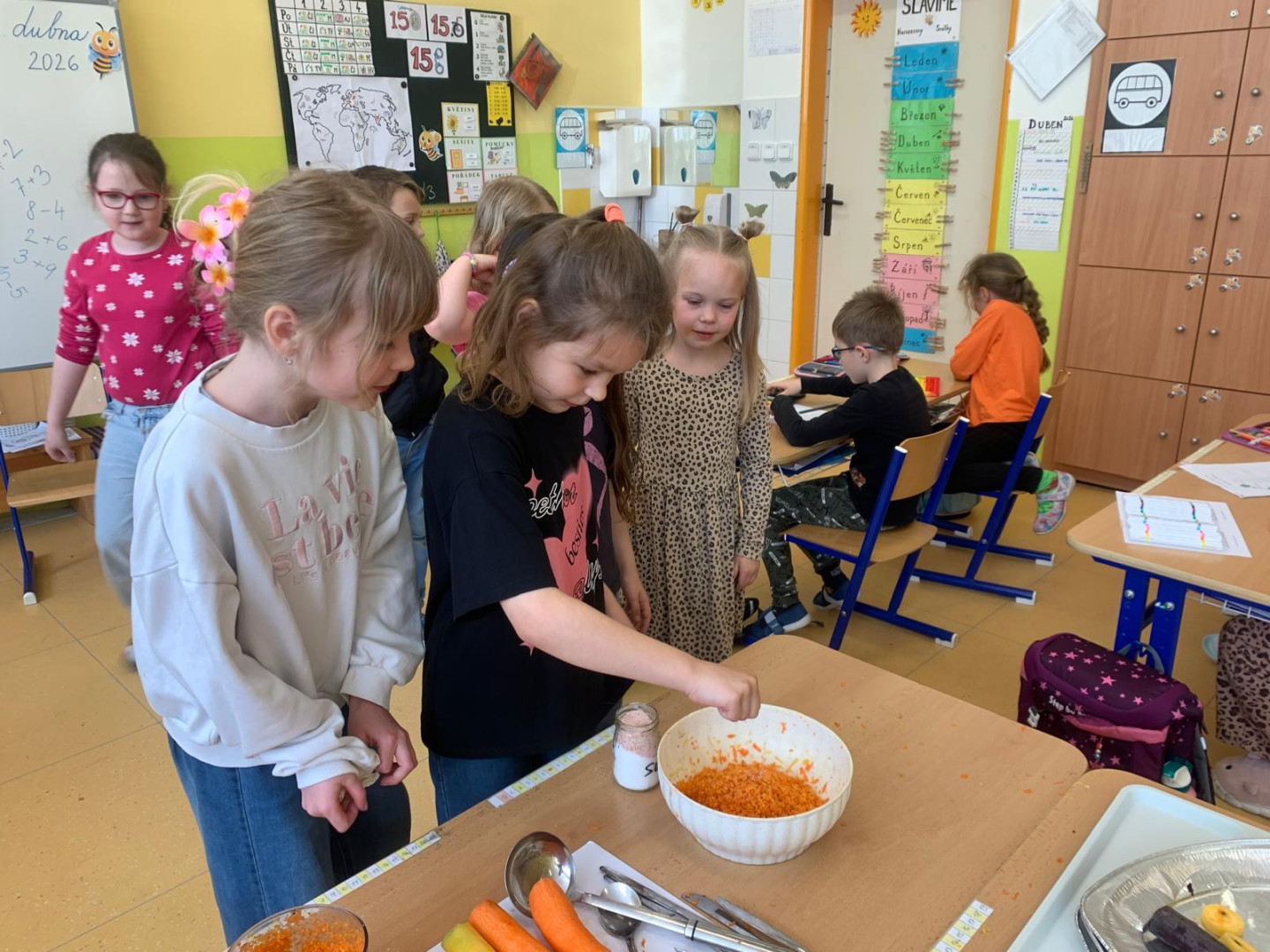 Největší radost však přinesla praktická část. Ochutnávali jsme různé druhy mrkve a pečlivě hodnotili, která je nejsladší, nejkřupavější a která by „vyhrála mrkvového Oscara“. Poté si žáci sami vyzkoušeli, co všechno se z mrkve dá připravit. Pekly se voňavé mrkvové hranolky, vznikaly chutné pomazánky i svěží saláty s jablky nebo ananasem. Někteří žáci byli překvapeni, že mrkev chutná výborně i jinak než jen v polévce od babičky.