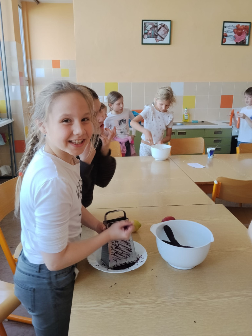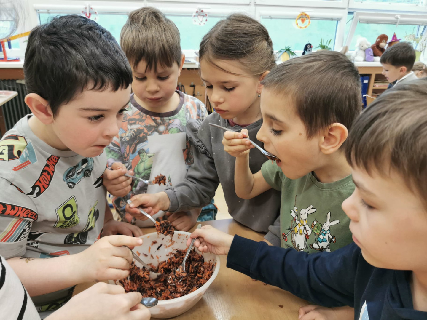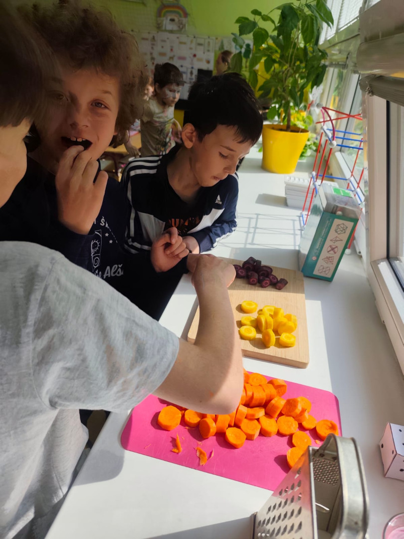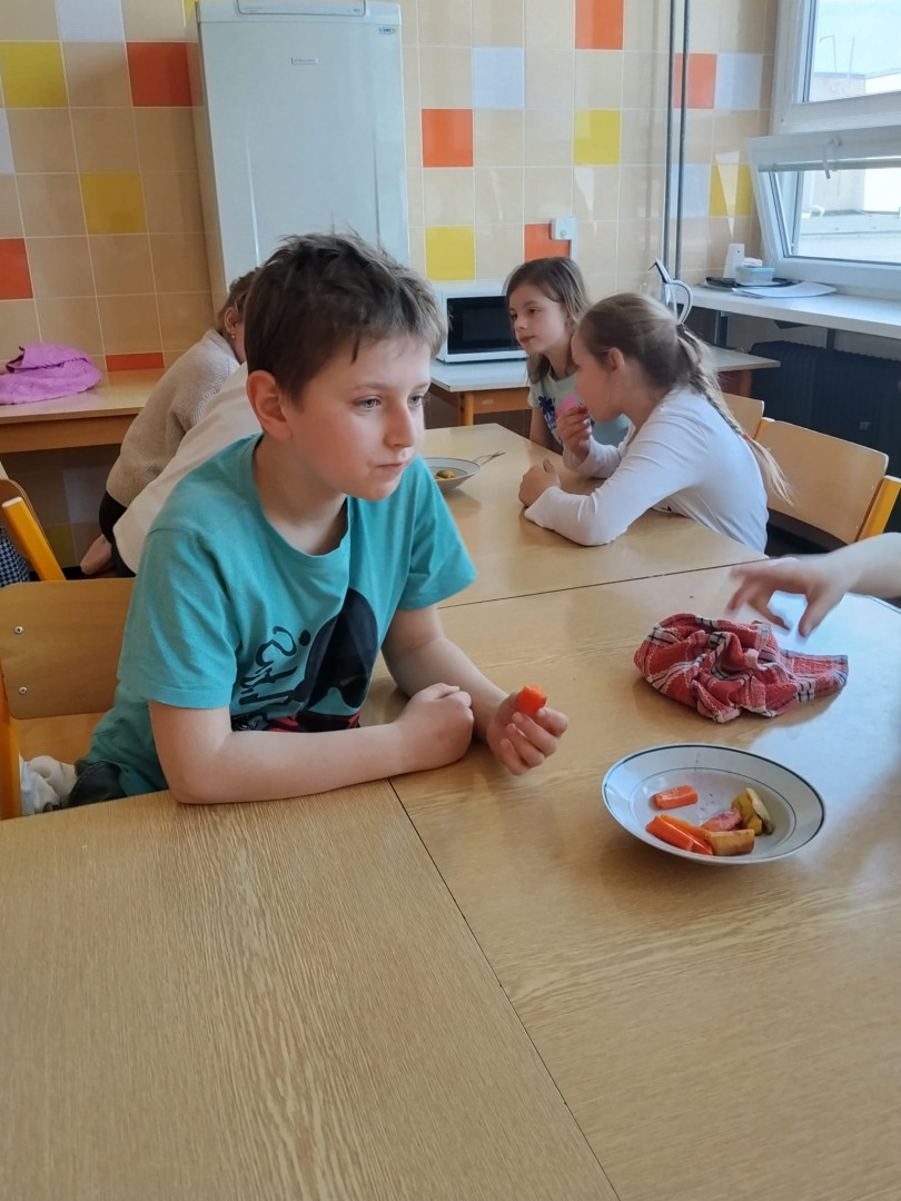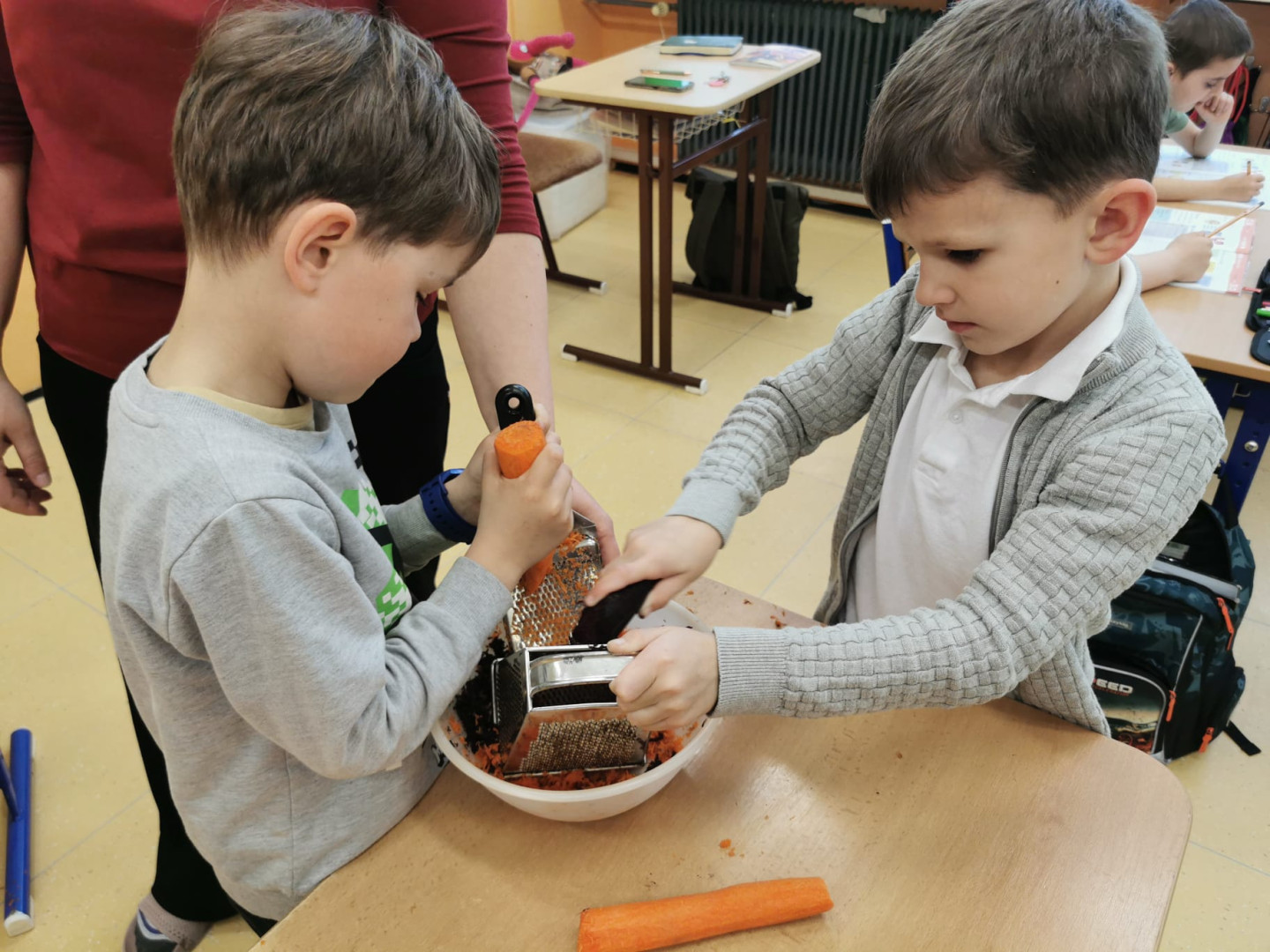 Největší radost však přinesla praktická část. Ochutnávali jsme různé druhy mrkve a pečlivě hodnotili, která je nejsladší, nejkřupavější a která by „vyhrála mrkvového Oscara“. Poté si žáci sami vyzkoušeli, co všechno se z mrkve dá připravit. Pekly se voňavé mrkvové hranolky, vznikaly chutné pomazánky i svěží saláty s jablky nebo ananasem. Někteří žáci byli překvapeni, že mrkev chutná výborně i jinak než jen v polévce od babičky.