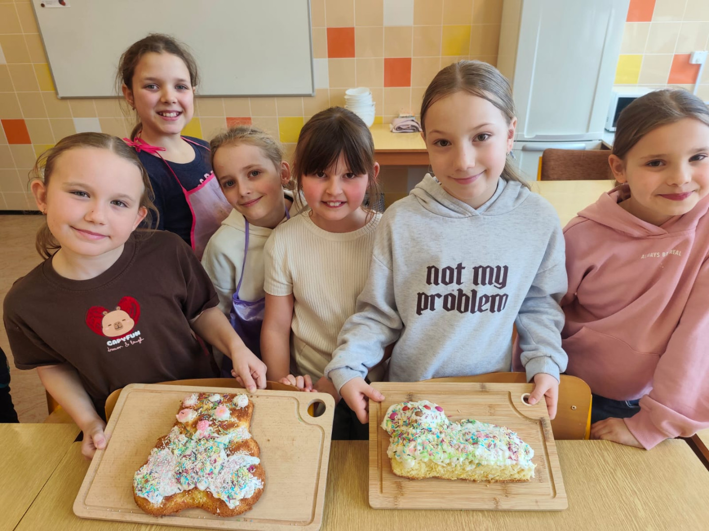 Nakonec jsme všechno ozdobili a tady vidíte naše spokojené tváře i výrobky. Zítra budeme krájet a ochutnávat, ale už teď nám drobečky kolem moc chutnaly.