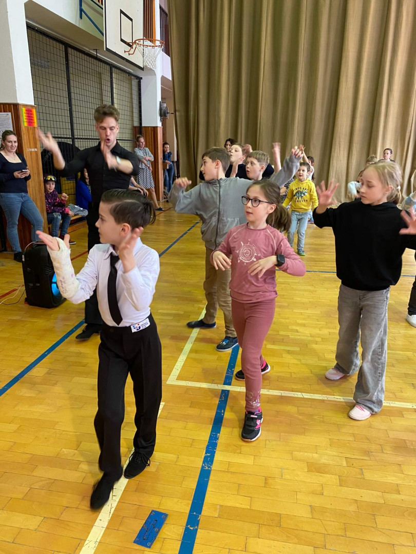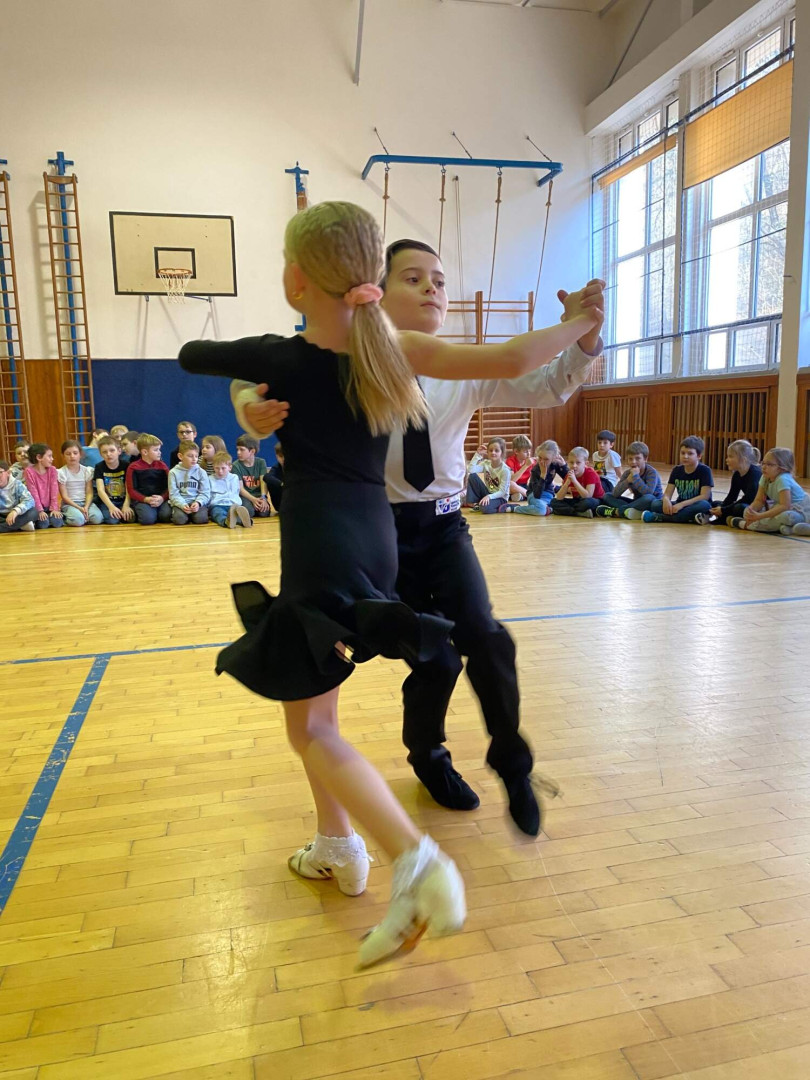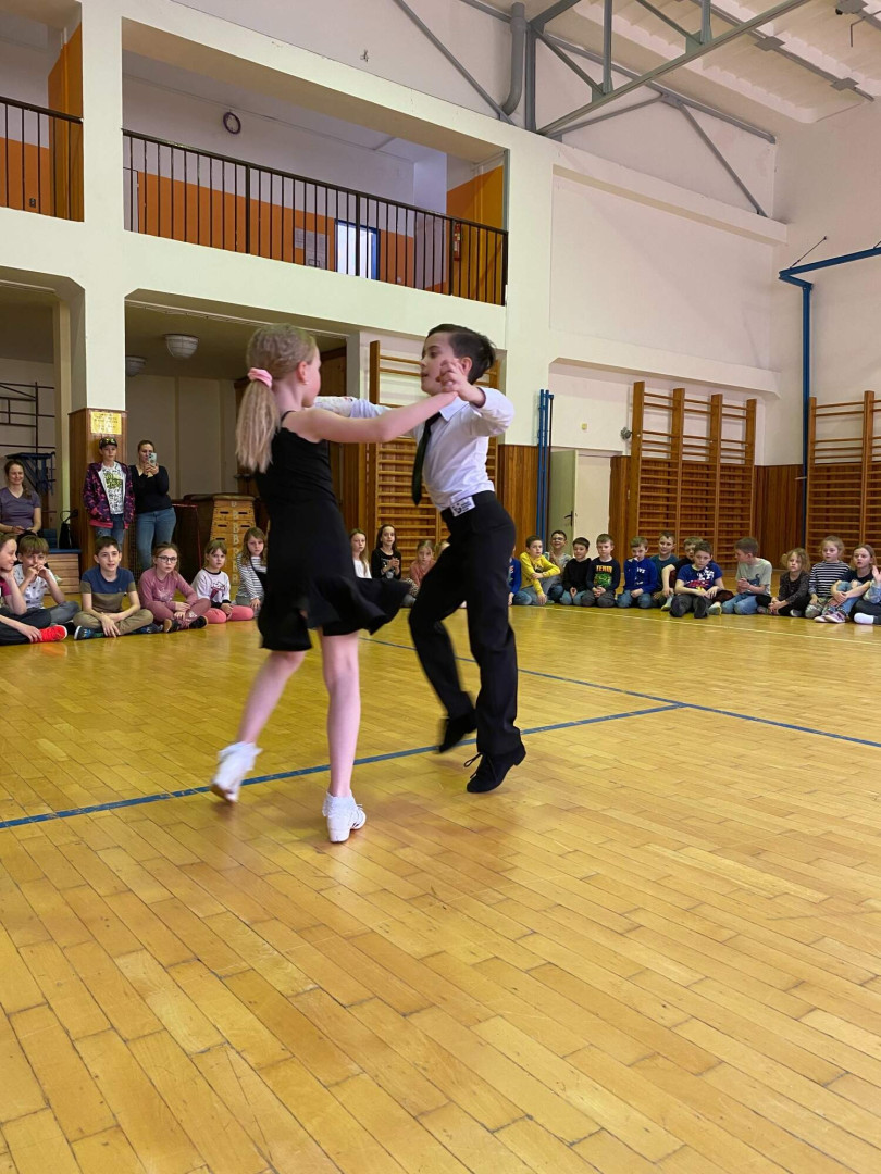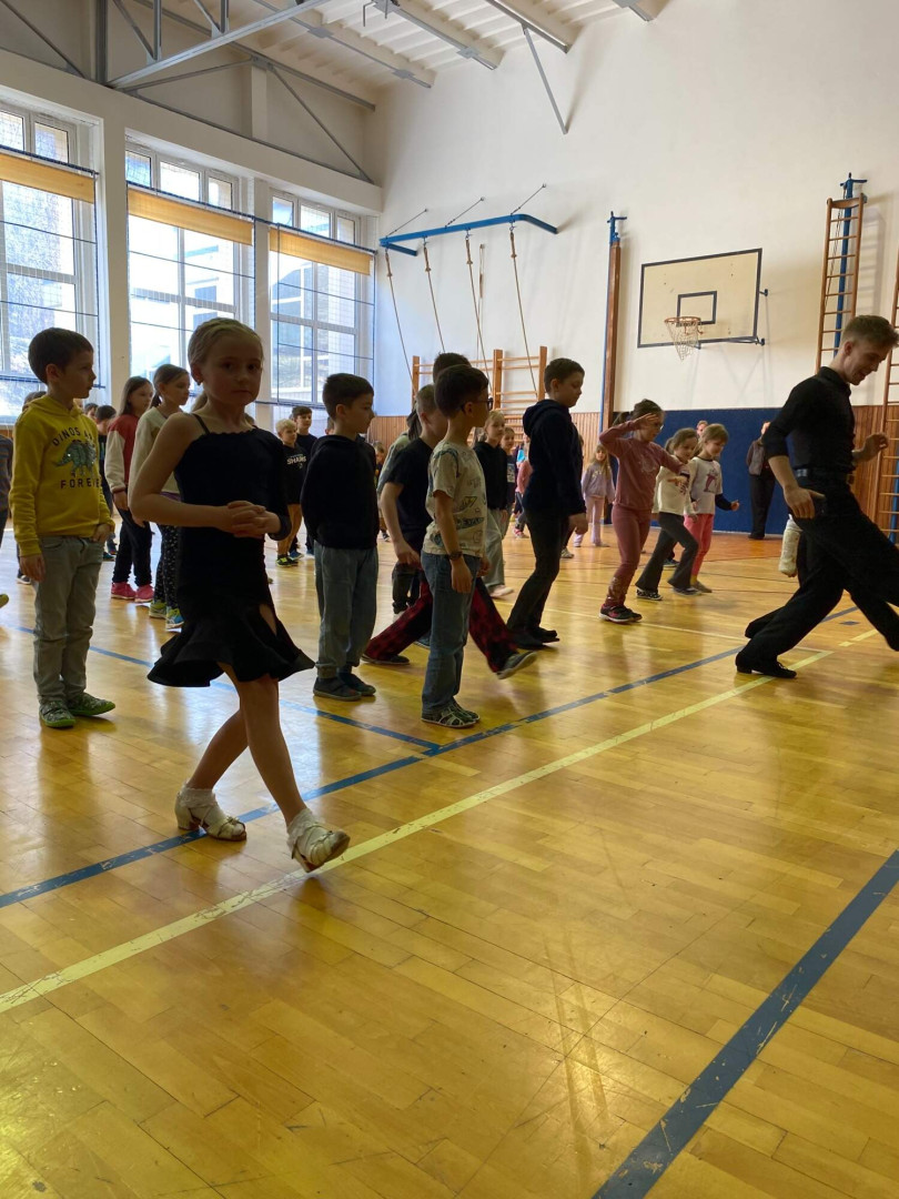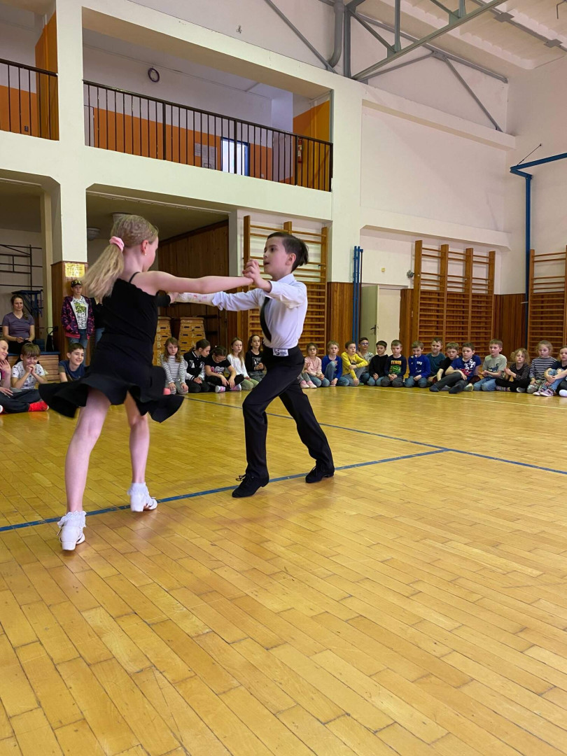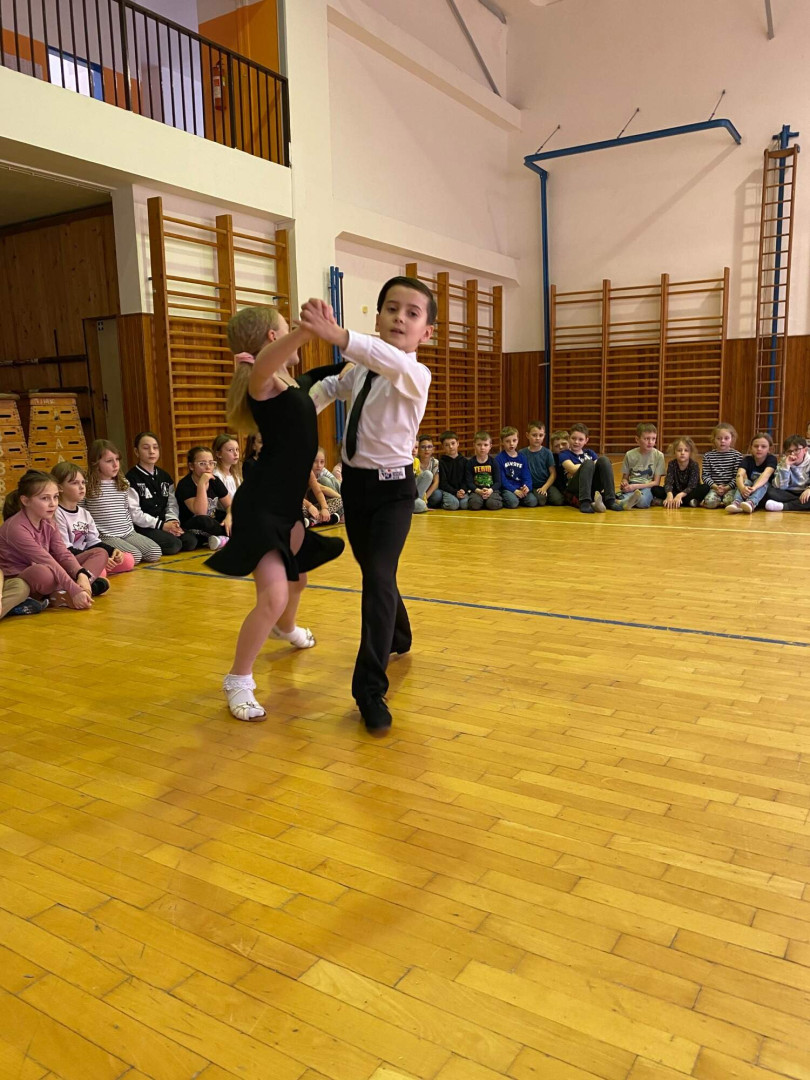Všechny děti se s nadšením zapojily. Nikdo nezůstal sedět – naopak, celá tělocvična byla plná pohybu, smíchu a dobré nálady. Bylo až překvapivé, jak moc děti celý program bavil a jak se přirozeně nechaly vtáhnout do rytmů samby, chachy, jivu, waltzu a polky. Třešničkou na dortu byla ukázka všech pěti tanců od malých profi tanečníků.