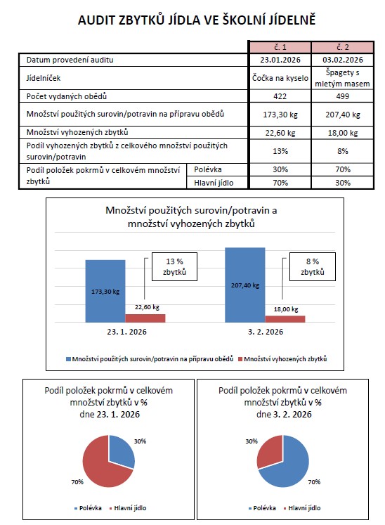 V rámci projektu Skutečně zdravá škola jsme uspořádali v naší školní jídelně audit plýtvání jídlem. Cílem bylo zjistit, proč žáci některé pokrmy nedojídají, a zároveň je vést k zamyšlení nad tím, proč je důležité jídlem neplýtvat ve škole i doma.