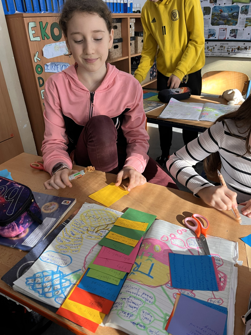 Součástí závěrečných aktivit byla tvorba vlastních učebních pomůcek. Žáci si nejprve připravili učební kartičky s klíčovými tématy a pojmy vztahujícími se k probírané látce. Následně vytvářeli edukativní kolečka se zástupci jednotlivých skupin živých organismů.