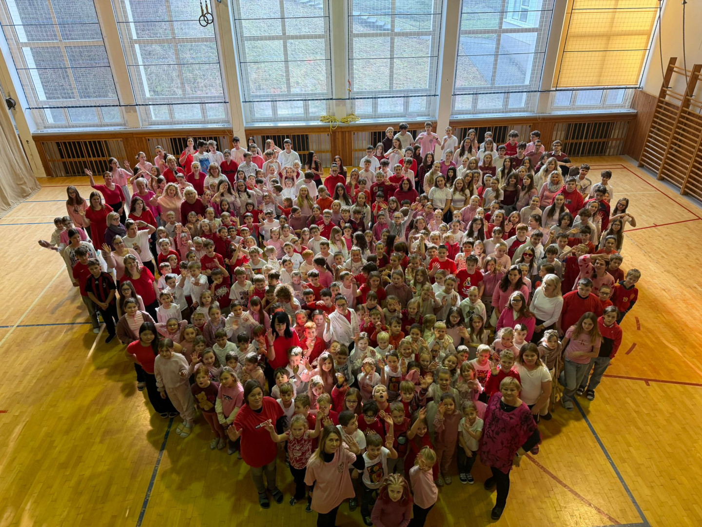 Vyvrcholením celého týdne bylo čtvrteční celoškolní focení. Škola se proměnila v moře růžové, bílé a červené barvy. Společná fotografie ve tvaru srdce bude krásnou vzpomínkou na dny, kdy jsme si připomněli, že laskavost nic nestojí, ale má obrovskou hodnotu.