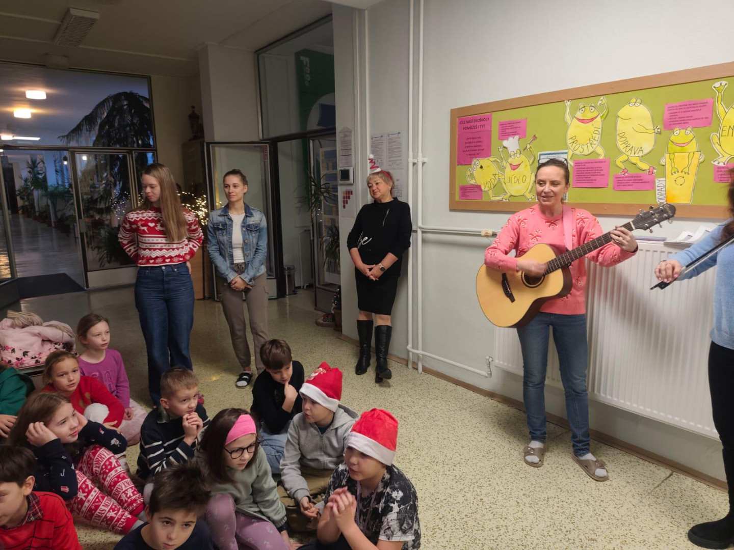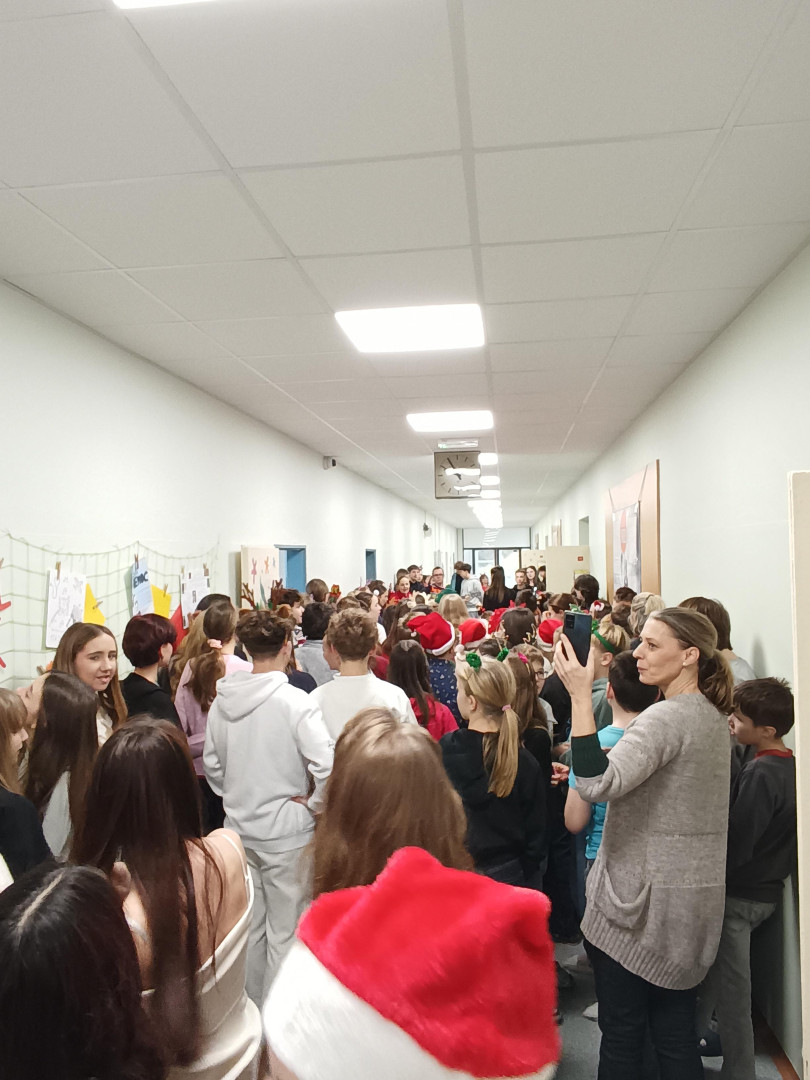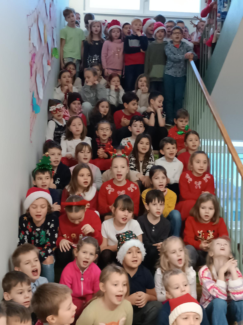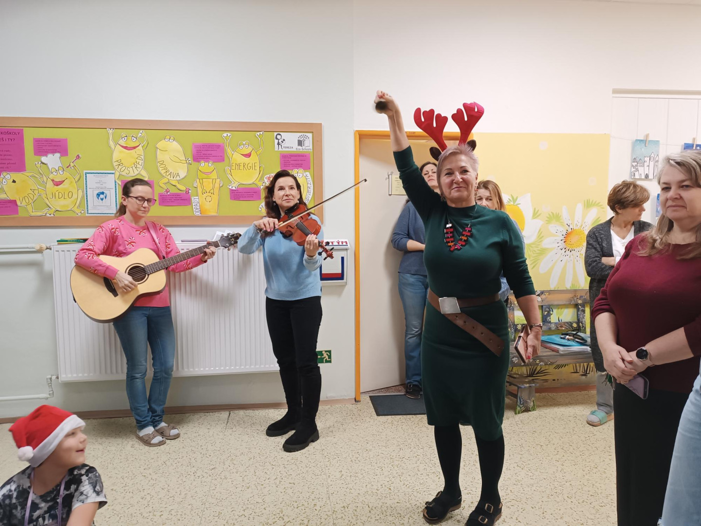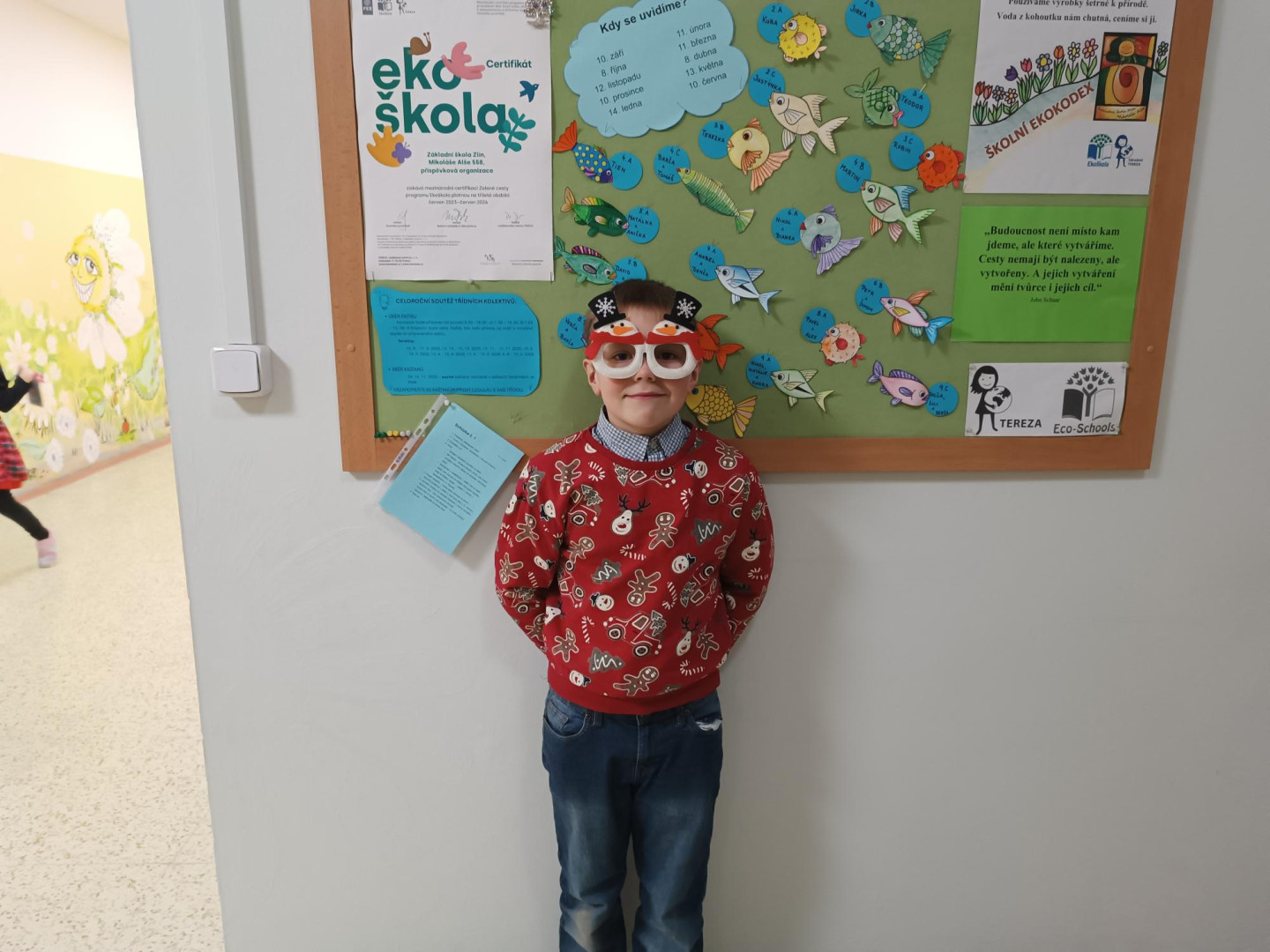 Po celé škole zněly vánoční písně a koledy. Společně jsme si zazpívali na schodišti i na chodbách školy. Krásnou vánoční náladu pomohla vytvořit také vánoční výzdoba tříd a vánoční oblečení, do kterého se oblékli nejen žáci, ale i pedagogičtí pracovníci.