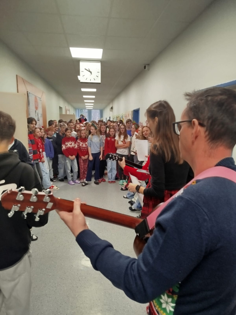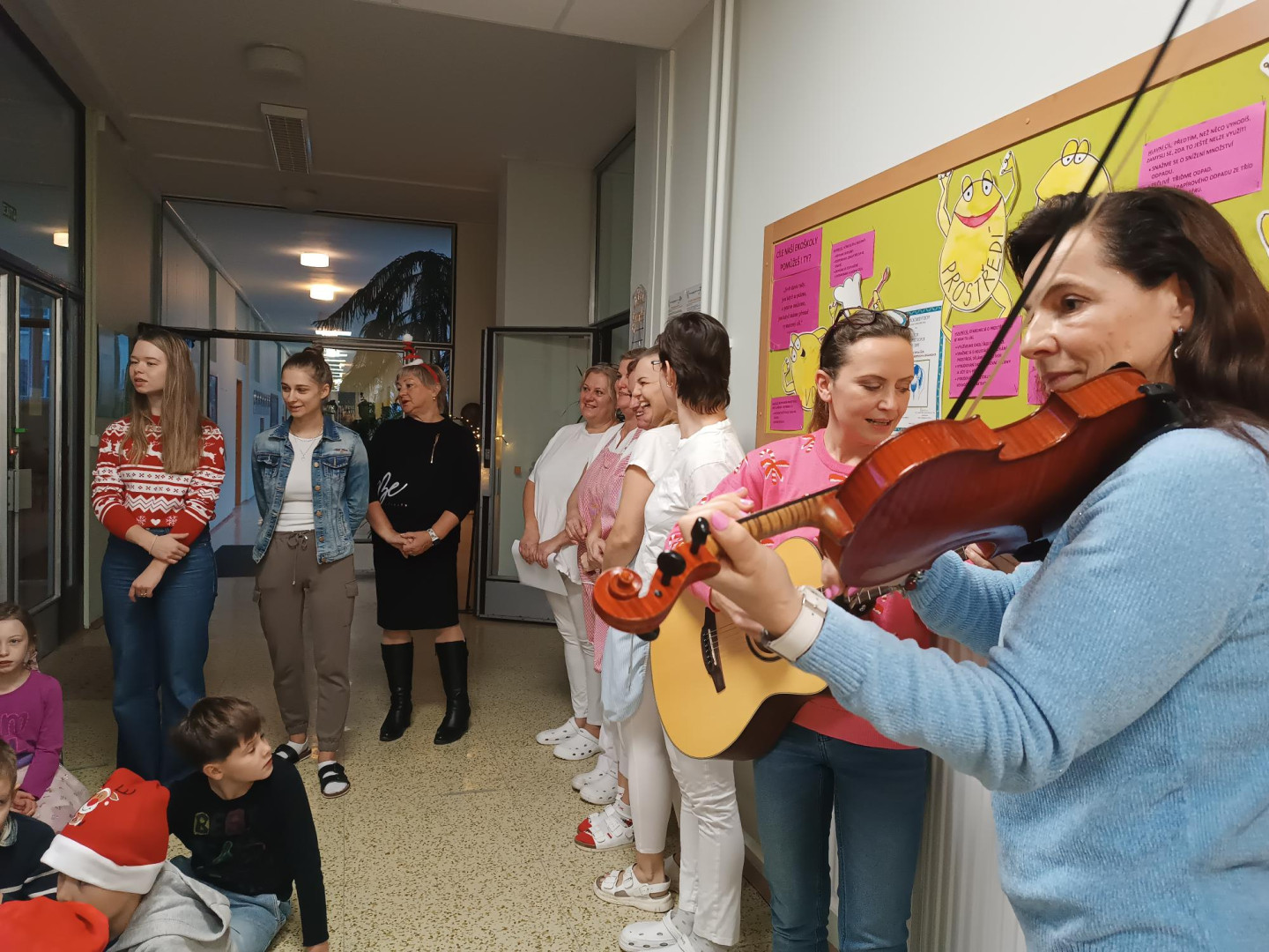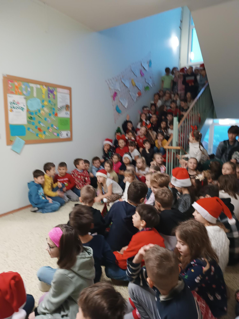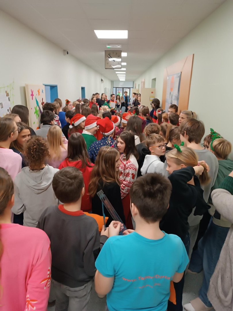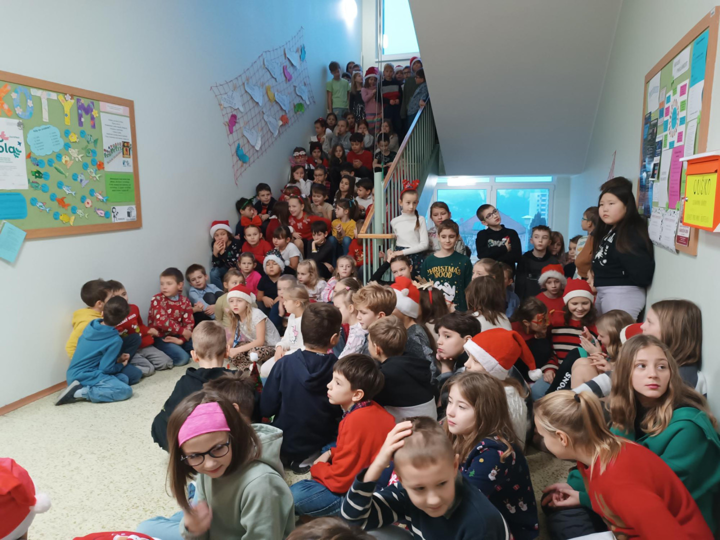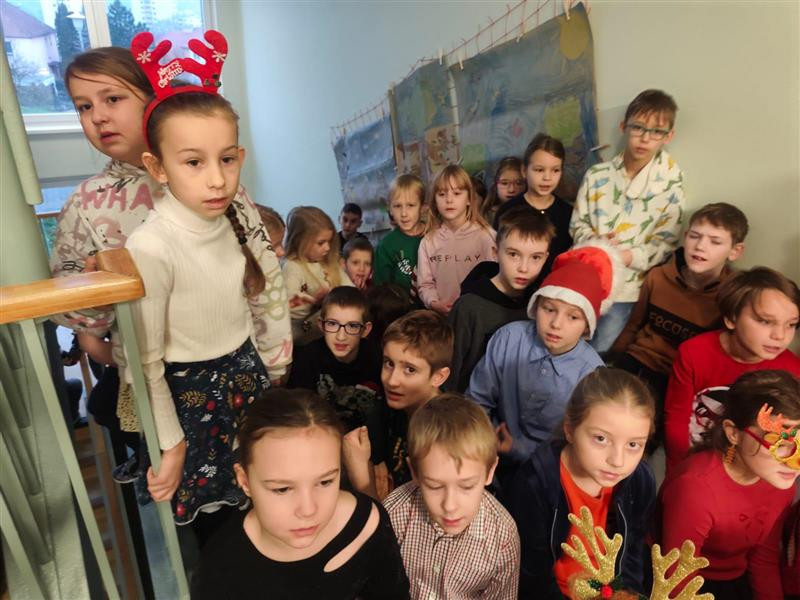 Po celé škole zněly vánoční písně a koledy. Společně jsme si zazpívali na schodišti i na chodbách školy. Krásnou vánoční náladu pomohla vytvořit také vánoční výzdoba tříd a vánoční oblečení, do kterého se oblékli nejen žáci, ale i pedagogičtí pracovníci.