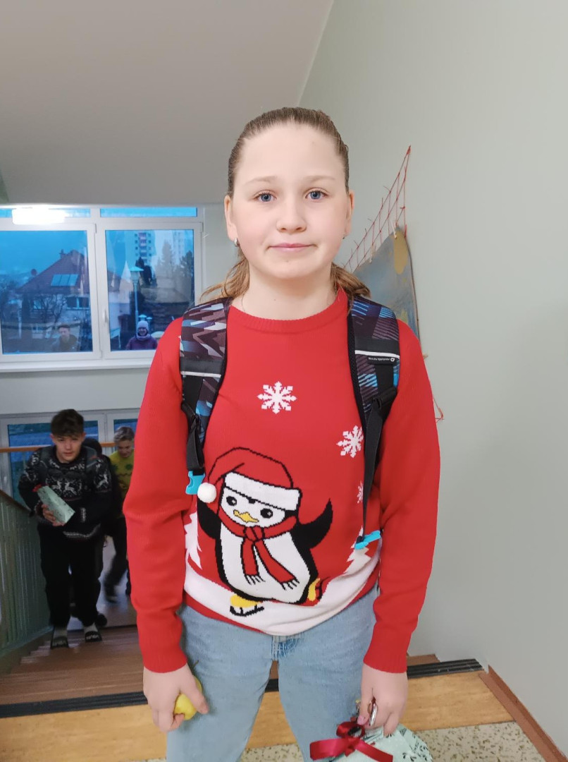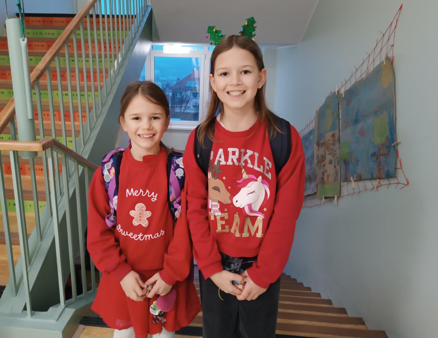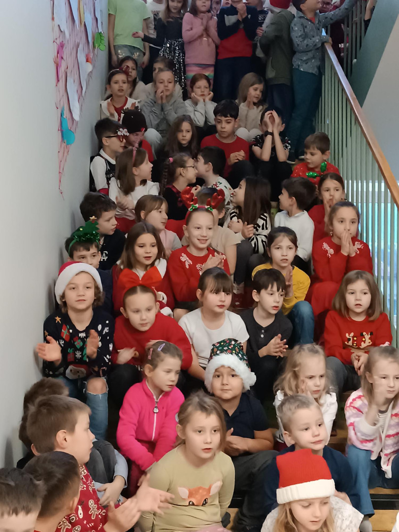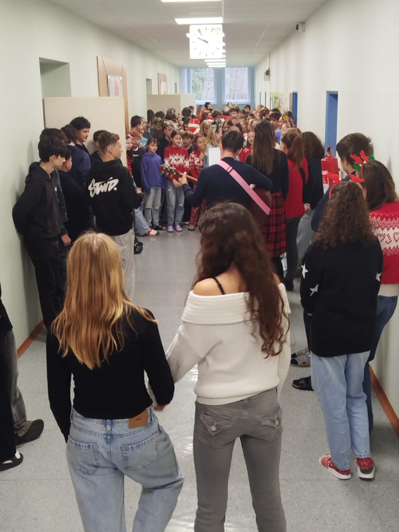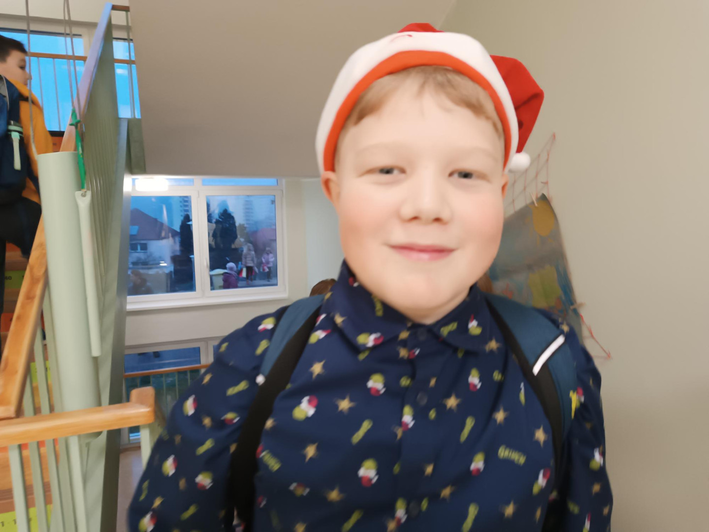 Po celé škole zněly vánoční písně a koledy. Společně jsme si zazpívali na schodišti i na chodbách školy. Krásnou vánoční náladu pomohla vytvořit také vánoční výzdoba tříd a vánoční oblečení, do kterého se oblékli nejen žáci, ale i pedagogičtí pracovníci.