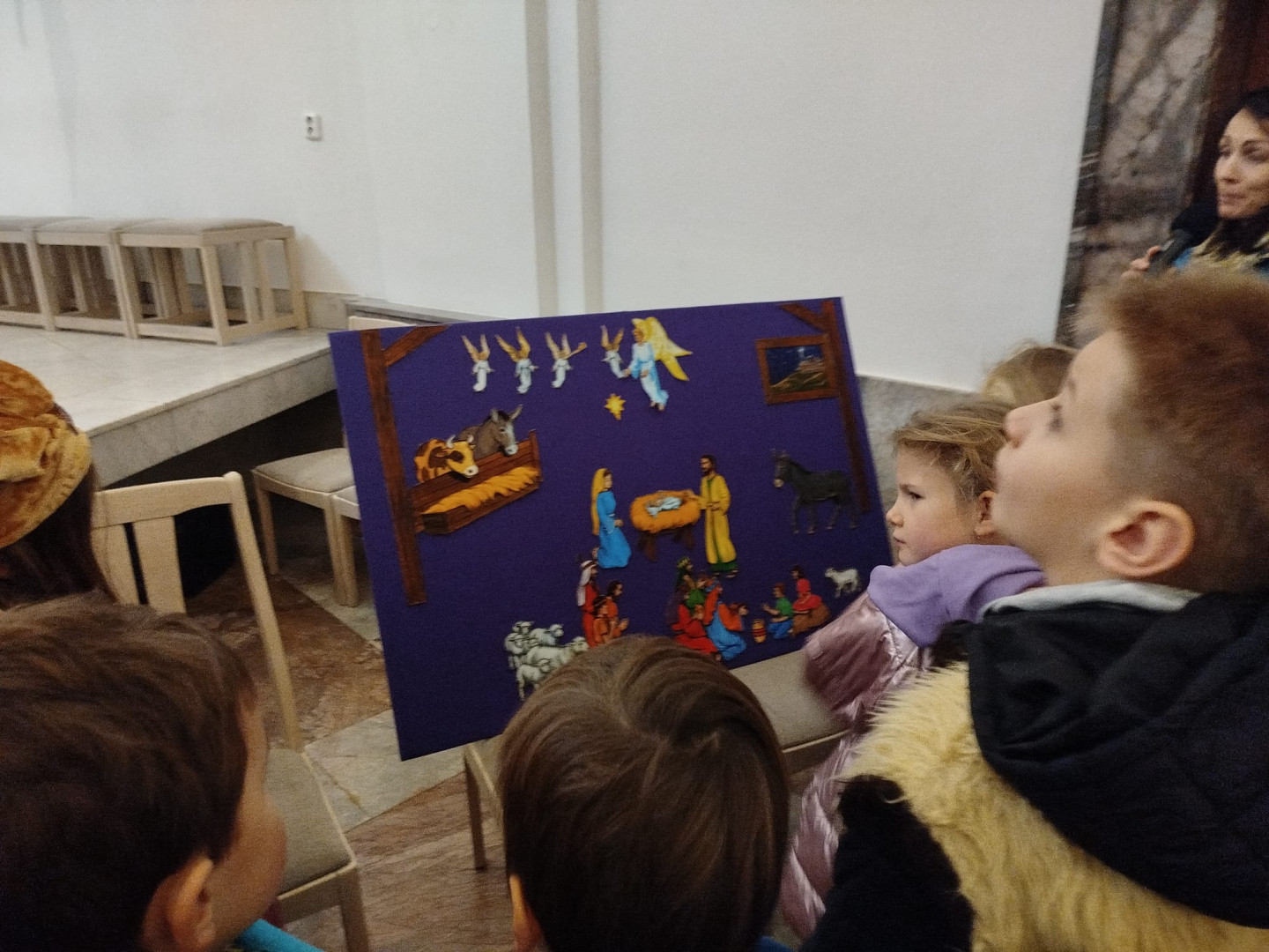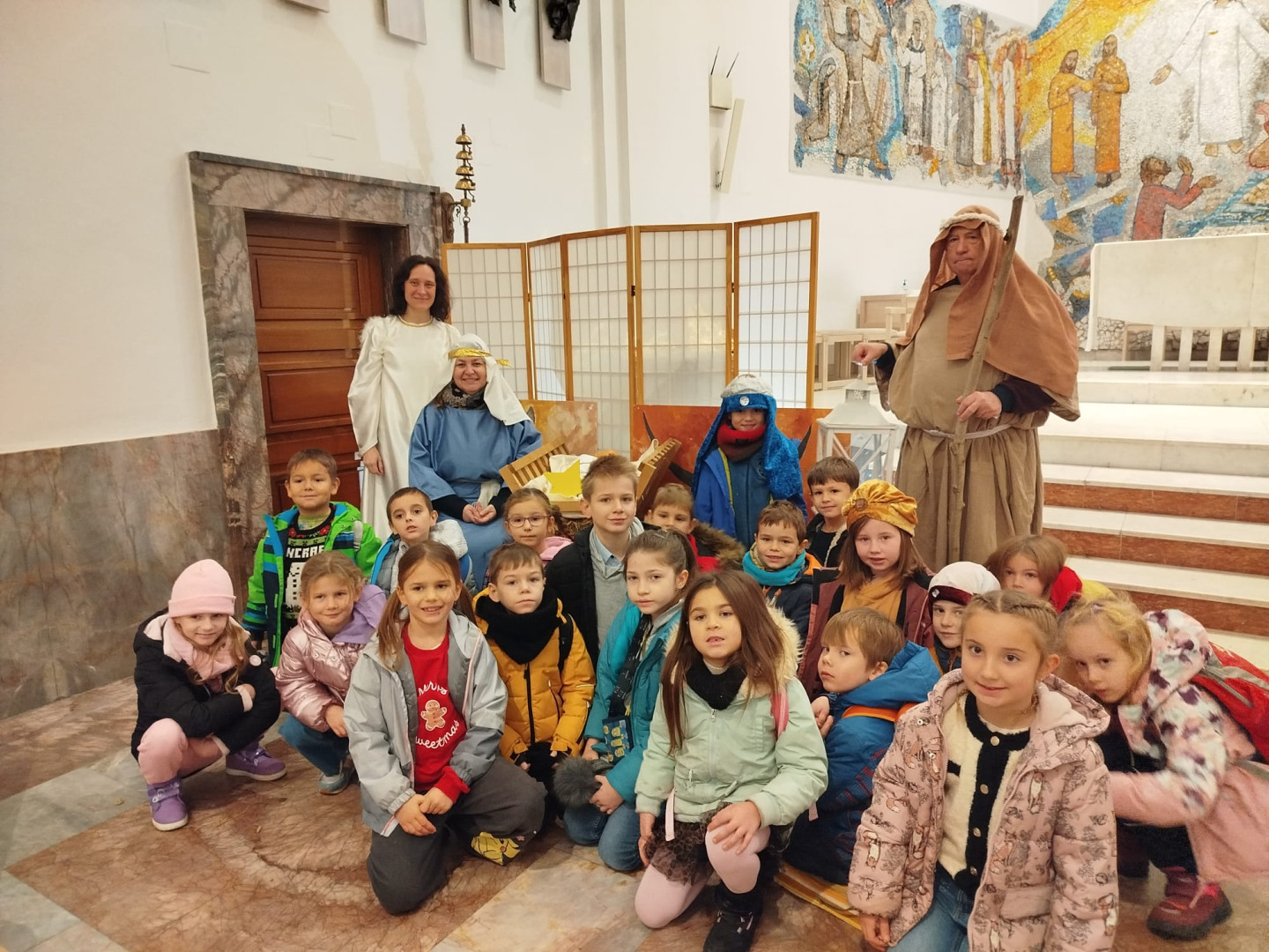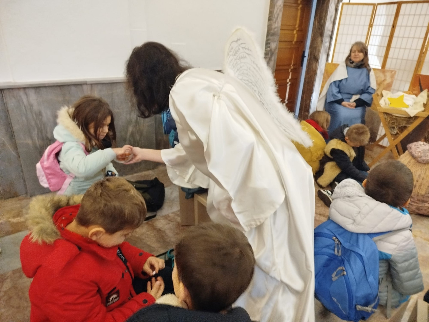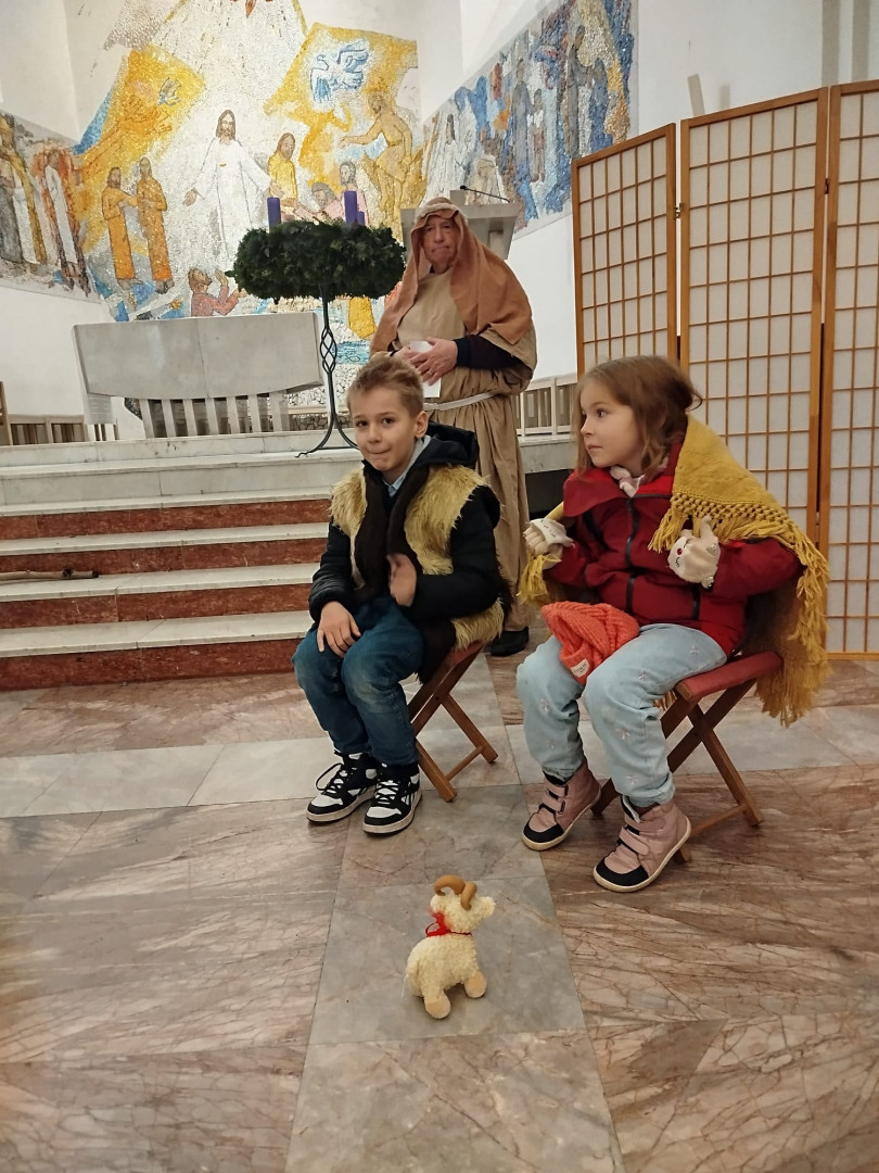 Dětem byl přiblížen také vánoční příběh – putování Josefa a Marie do Betléma. Paní učitelka se proměnila v Pannu Marii a z dětí se stali pastýři a tři králové.