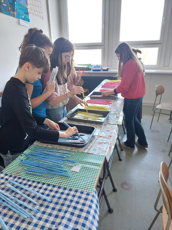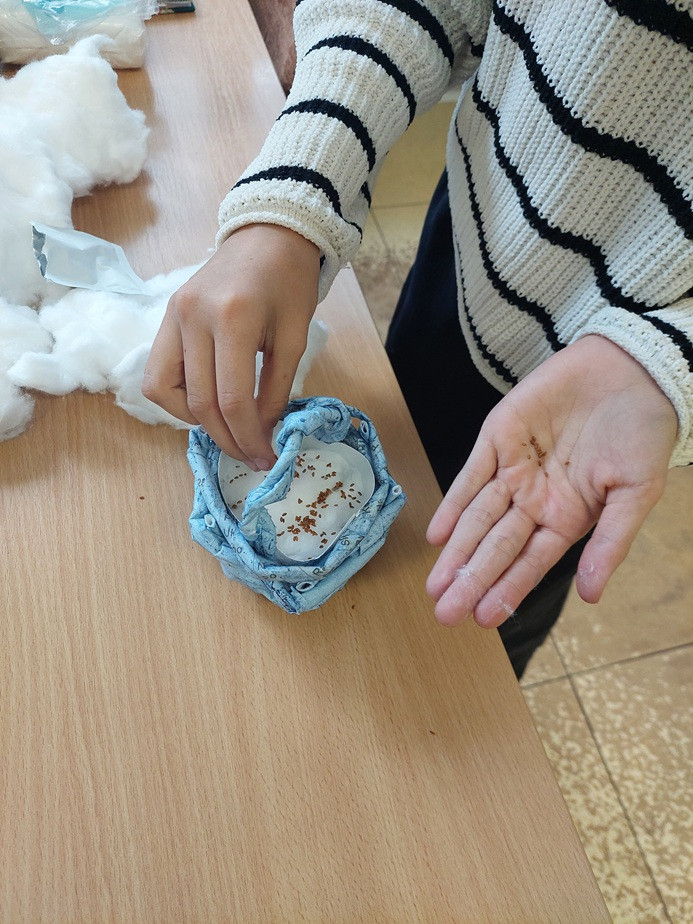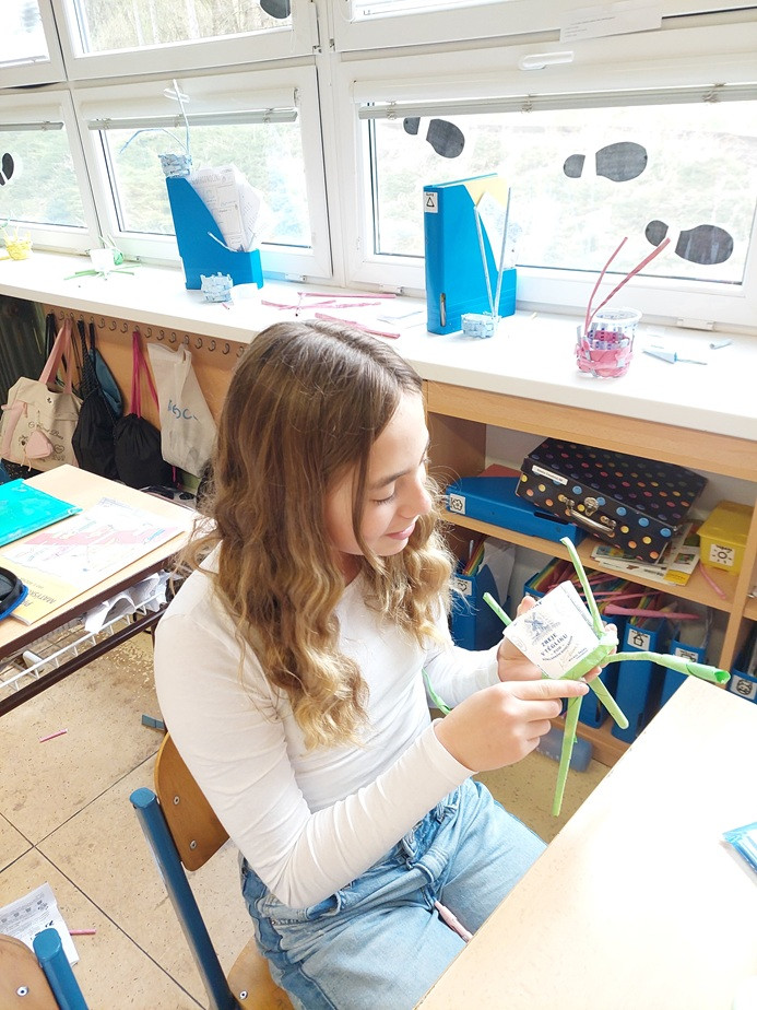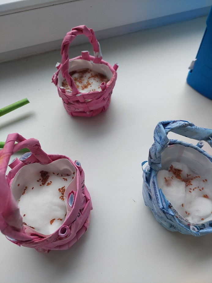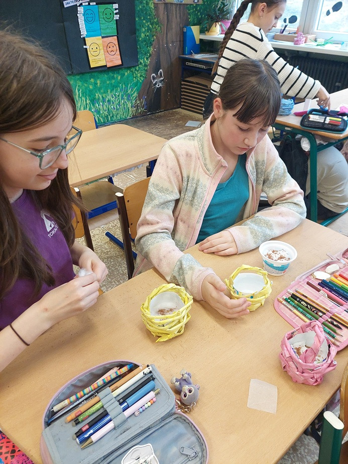 Abychom si opět připomněli ekologický přístup, pletli jsme košíky z papírových trubiček, které jsme vyráběli z papírů na vyhození a dovnitř košíku jsme dali kelímky od jogurtu. Děti nejprve motaly trubičky, barvily je, potom už pletly košík a nakonec do něj zasadily řeřichu. Až řeřichu sklidí, můžou košík dále využívat - mnozí ví už teď, co si do něj schovají.